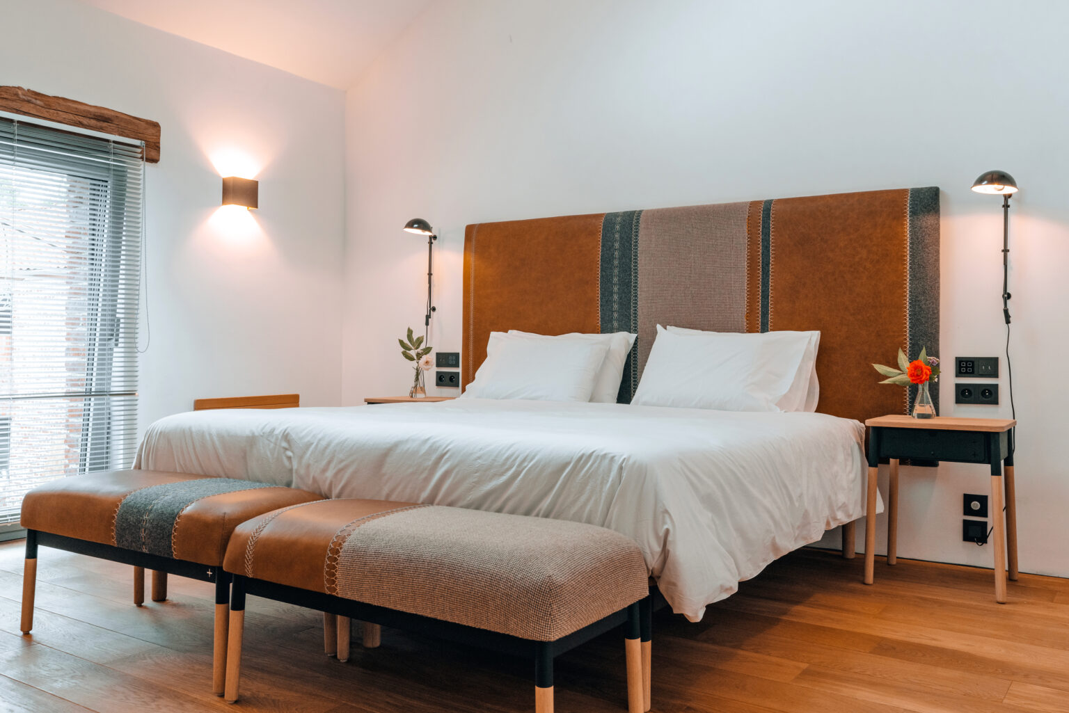 Según la habitación que elijas, dispondrás de las siguientes comodidades: cama king-size, balcón o terraza, vigas vistas, vistas a la piscina, al jardín o al restaurante, cuarto de baño con bañera y/o ducha, zapatillas, albornoz, secador de pelo, zona de estar, Smart TV, cabecero y bancos hechos a medida y bordados a mano, pantalla de proyección en el loft, cafetera espresso, calefacción y suelo radiante, y aire acondicionado.