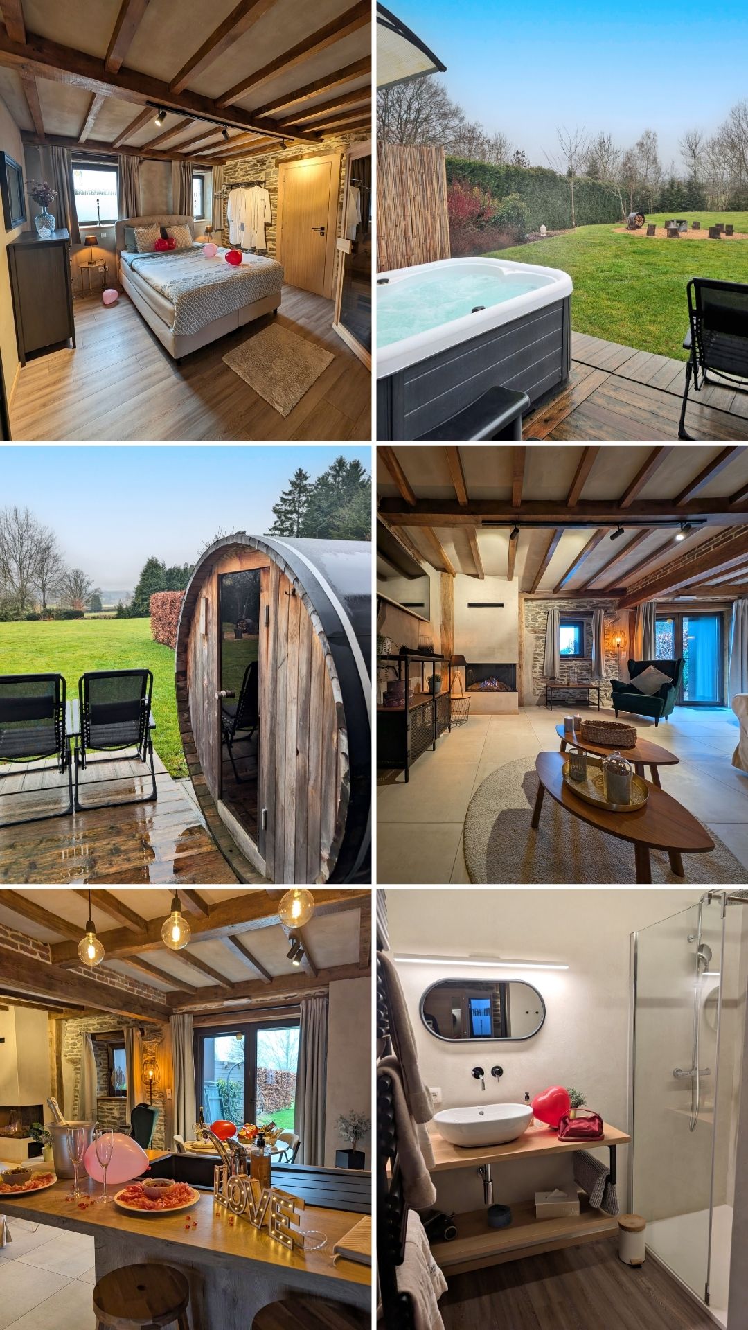 2Cosy est un petit coin de paradis situé à Gouvy, en Province du Luxembourg, en Belgique. Il y a 2 suites wellness entièrement privatives avec chacune un jacuzzi extérieur et un sauna. Quel charme ! Et les matériaux utilisés sont exceptionnels.