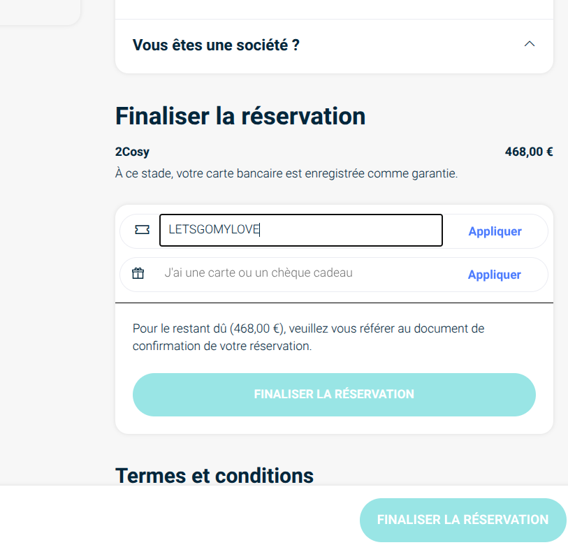 Tapez le code promo LETSGOMYLOVE durant la réservation sur le site officiel de notre partenaire et bénéficiez de -5% de réduction sur votre séjour pour toute réservation. Regardez cette image pour voir où taper le code. Le code est également valable si vous achetez une carte cadeau à offrir.