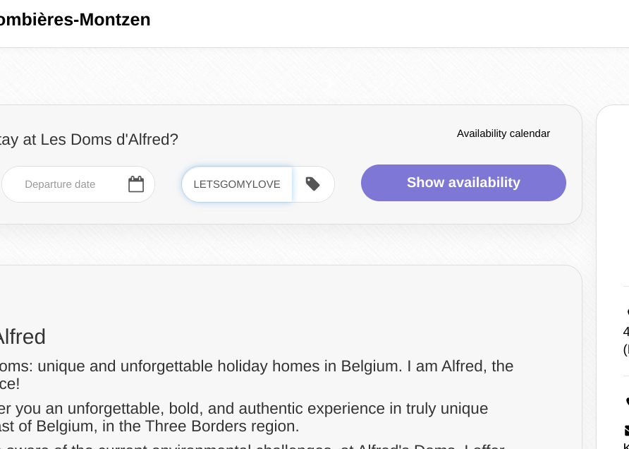 Tapez le code promo LETSGOMYLOVE au moment de réserver sur le site officiel de notre partenaire et bénéficiez d'une réduction de -10% sur votre séjour. Regardez cette image pour voir où taper le code.
