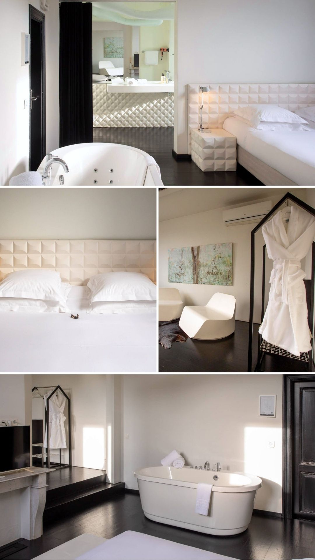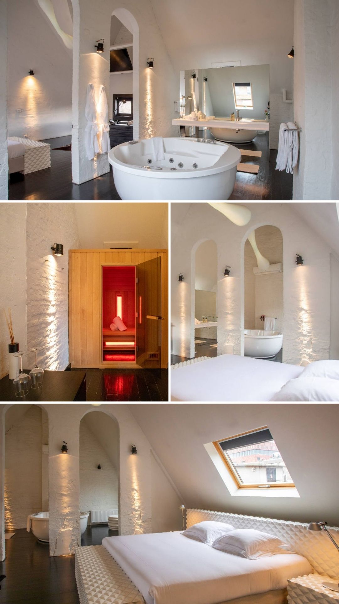 Il y a 5 suites décorées de façon élégante et minimaliste. Selon votre choix, vous disposez des équipements suivants : literie king size de qualité hôtelière, douche à effet de pluie, mobilier design, sièges en mousse, jeux de lumière, baignoire balnéo ou jacuzzi, sauna, Smart TV, machine à café Nespresso et plein de petites attentions qui font très plaisir : chocolats, bonbons et petit mot de bienvenue notamment.