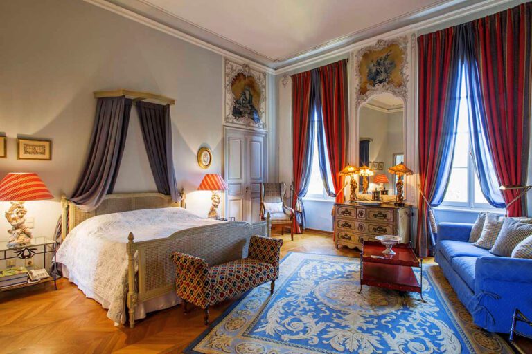 Le château propose 5 grandes chambres (rouge, bleue, verte, cerise et jaune) et 3 appartements privés à la décoration élégante et majestueuse. Selon la chambre, vous disposez notamment des équipements suivants : superficie de 42m² à 98m² pour la plus grande, lit king size, salle de bain privative avec baignoire, magnifiques fresques, climatisation et vue sur le vignoble.