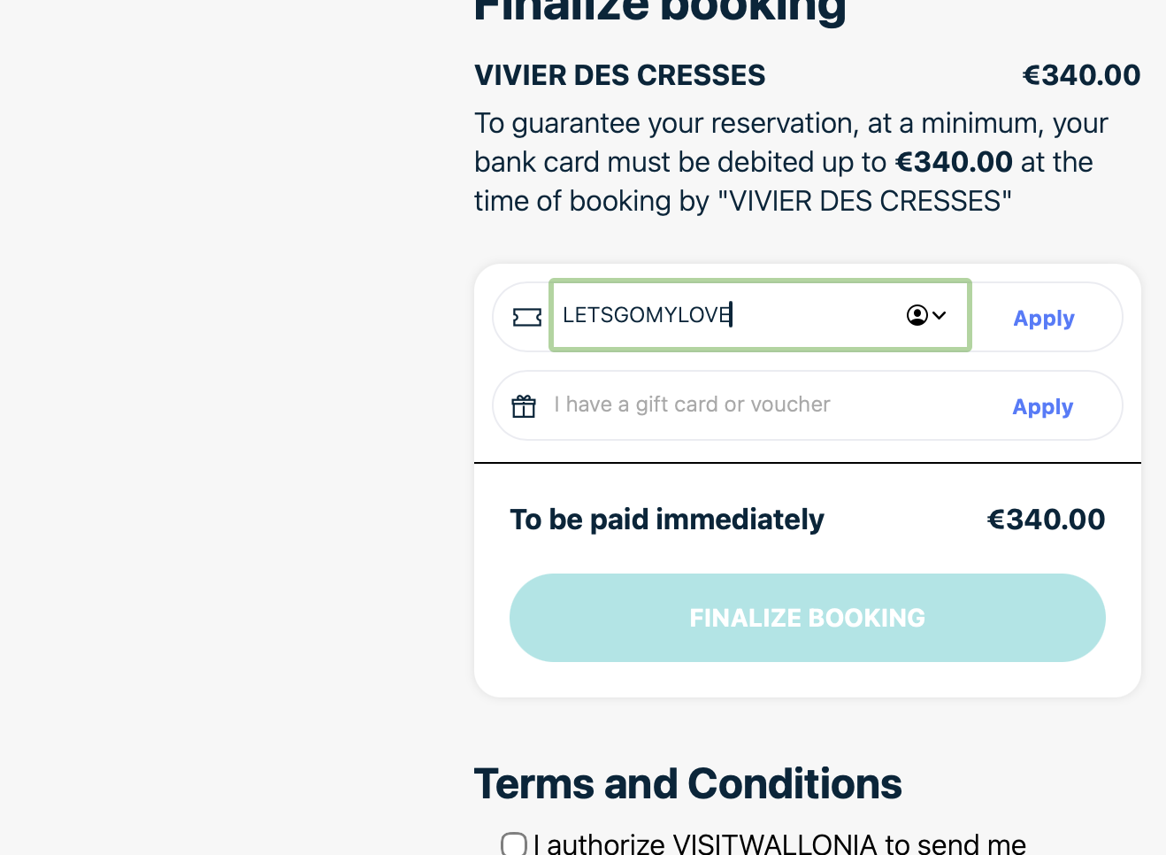Tapez le code promo LETSGOMYLOVE au moment de réserver sur le site officiel de notre partenaire et bénéficiez de 10% de réduction sur votre séjour. Le code fonctionne aussi si vous achetez une carte cadeau. Cliquez sur cette capture d'écran pour voir à quel endroit taper le code.