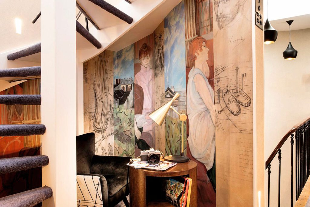 L'hôtel est idéalement situé sur la butte de Montmartre, à seulement 10 min du Sacré-Cœur, dans le quartier des Abbesses. C'est notre quartier préféré à Paris. C'est celui des cartes postales et des films. Il y a une légèreté dans l’air, une insouciance presque palpable, comme si le temps y glissait avec douceur. Les ruelles pavées serpentent entre les façades pastel, dévoilant à chaque tournant une terrasse ombragée, une boulangerie aux effluves enivrantes ou une galerie d’art confidentielle.