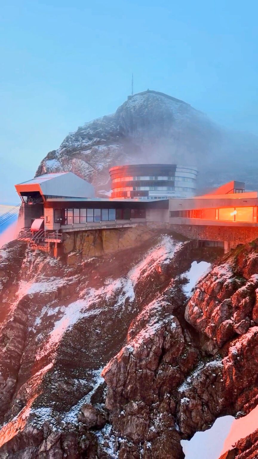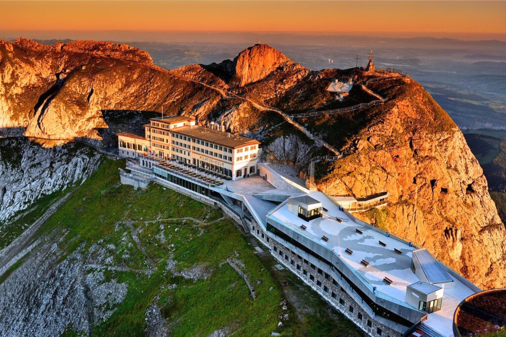 L'Hôtel Pilatus-Kulm est un hôtel 4* de montagne perché à 2000 mètres d'altitude, près de Lucerne, en Suisse. La vue à 360° sur le lac et les Alpes suisses est fantastique. On se sent au plus proche des étoiles. Quel plaisir de contempler le lever de soleil depuis votre lit, de vous lever très tôt et d'observer les bouquetins.