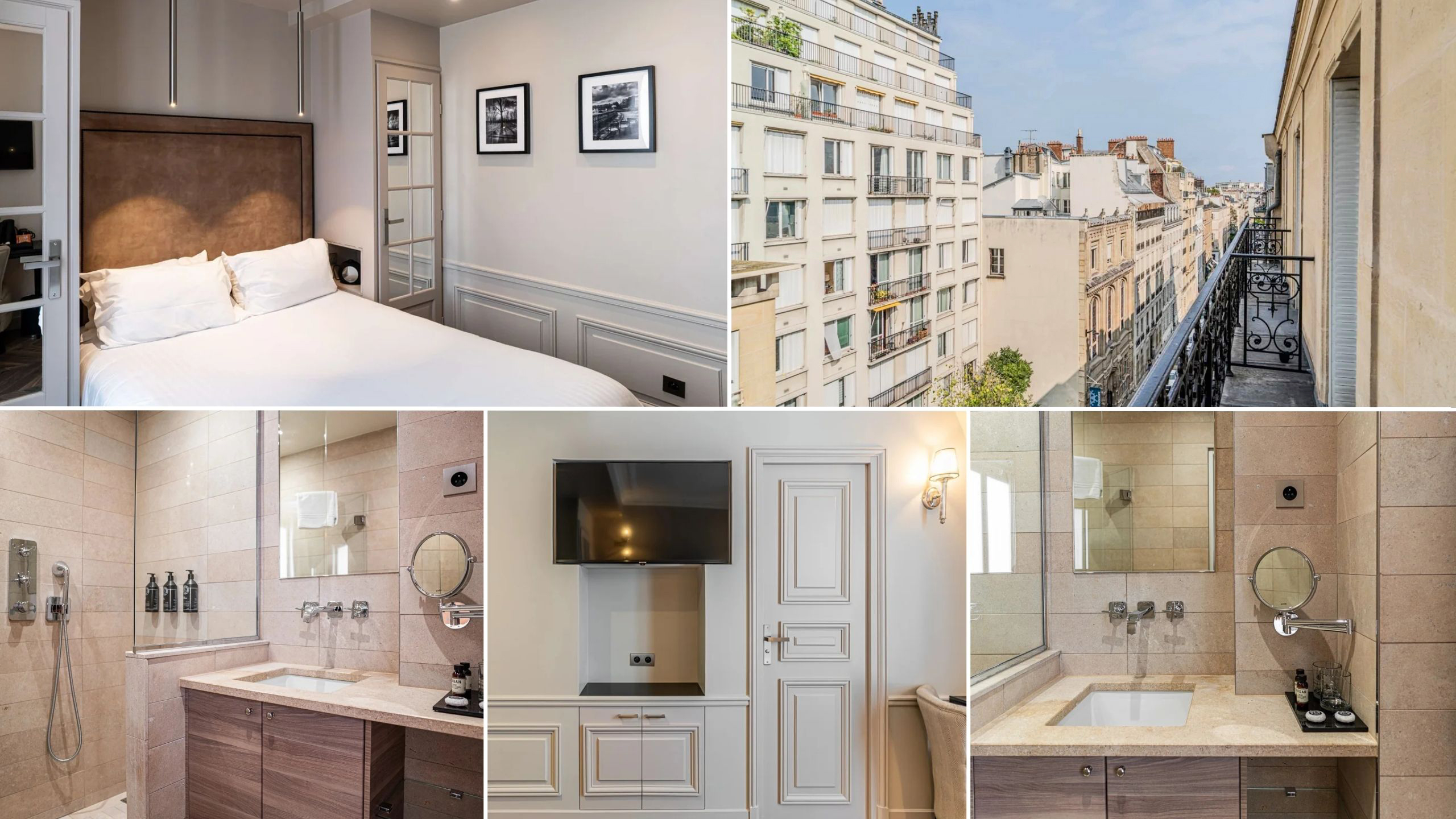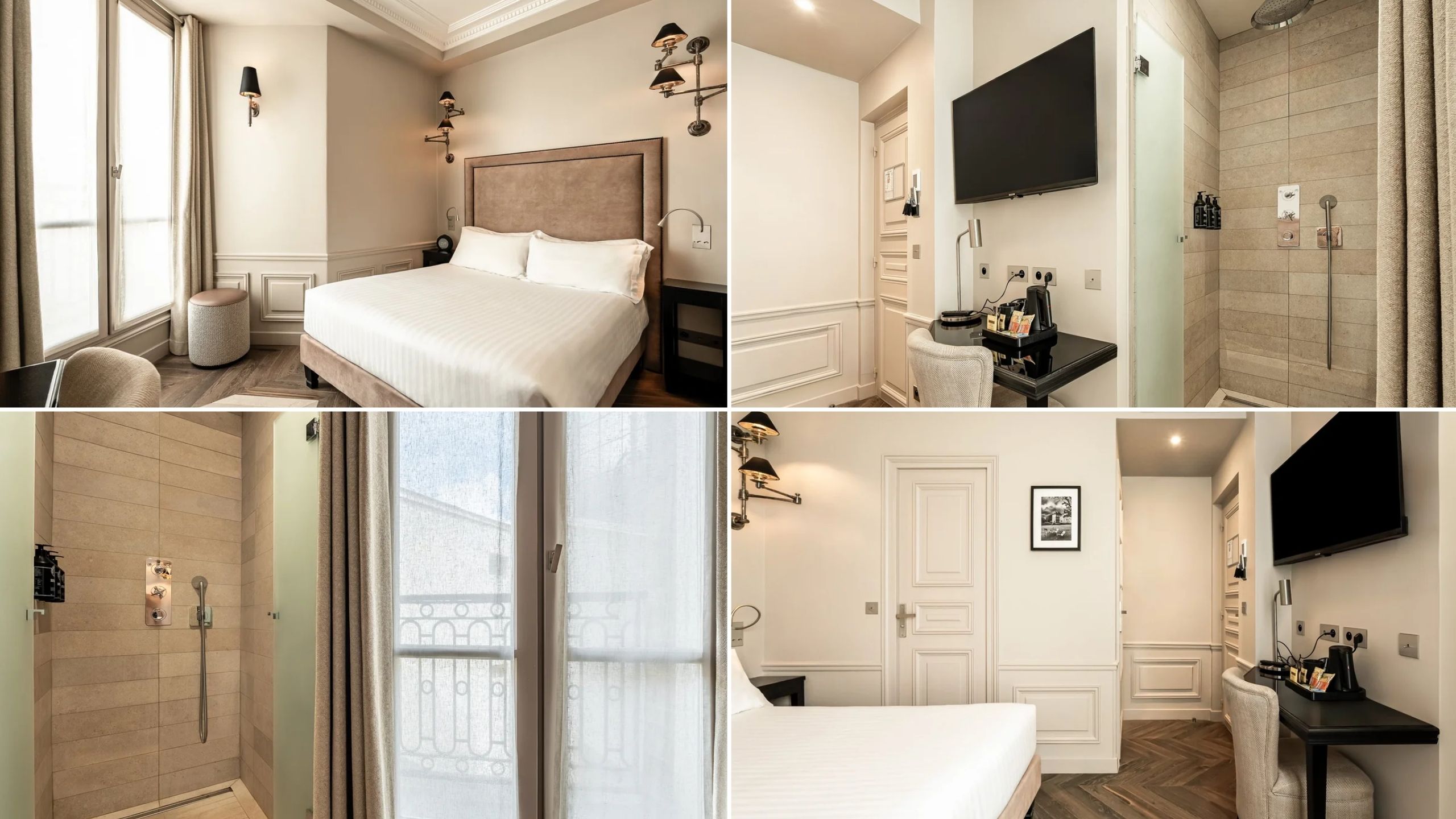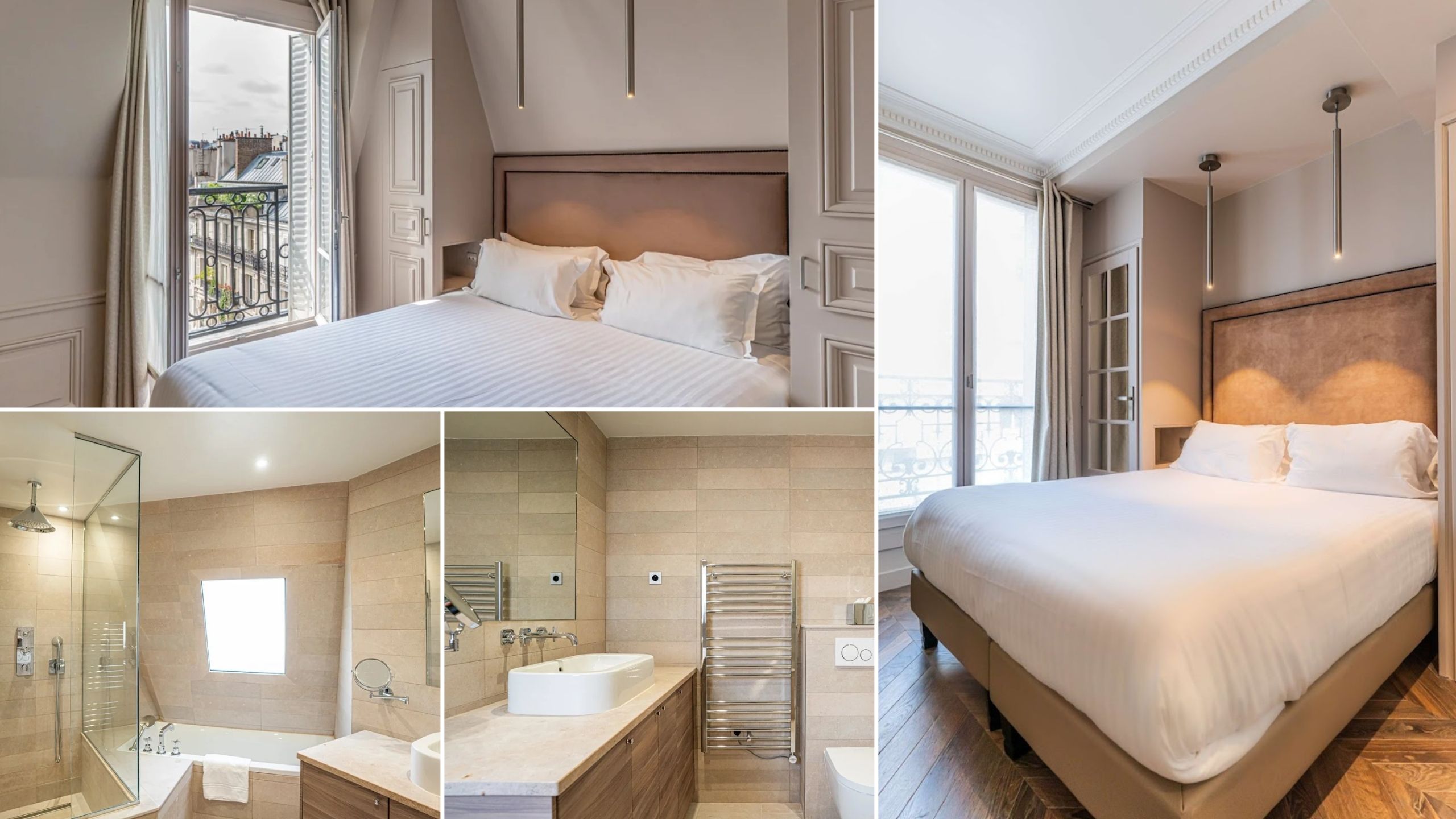 Les 24 chambres reflètent l’élégance parisienne : teintes douces, moulures, soubassements et parquet en chêne. Voici une vidéo de notre chambre. Quelques chambres que l'on aime bien :