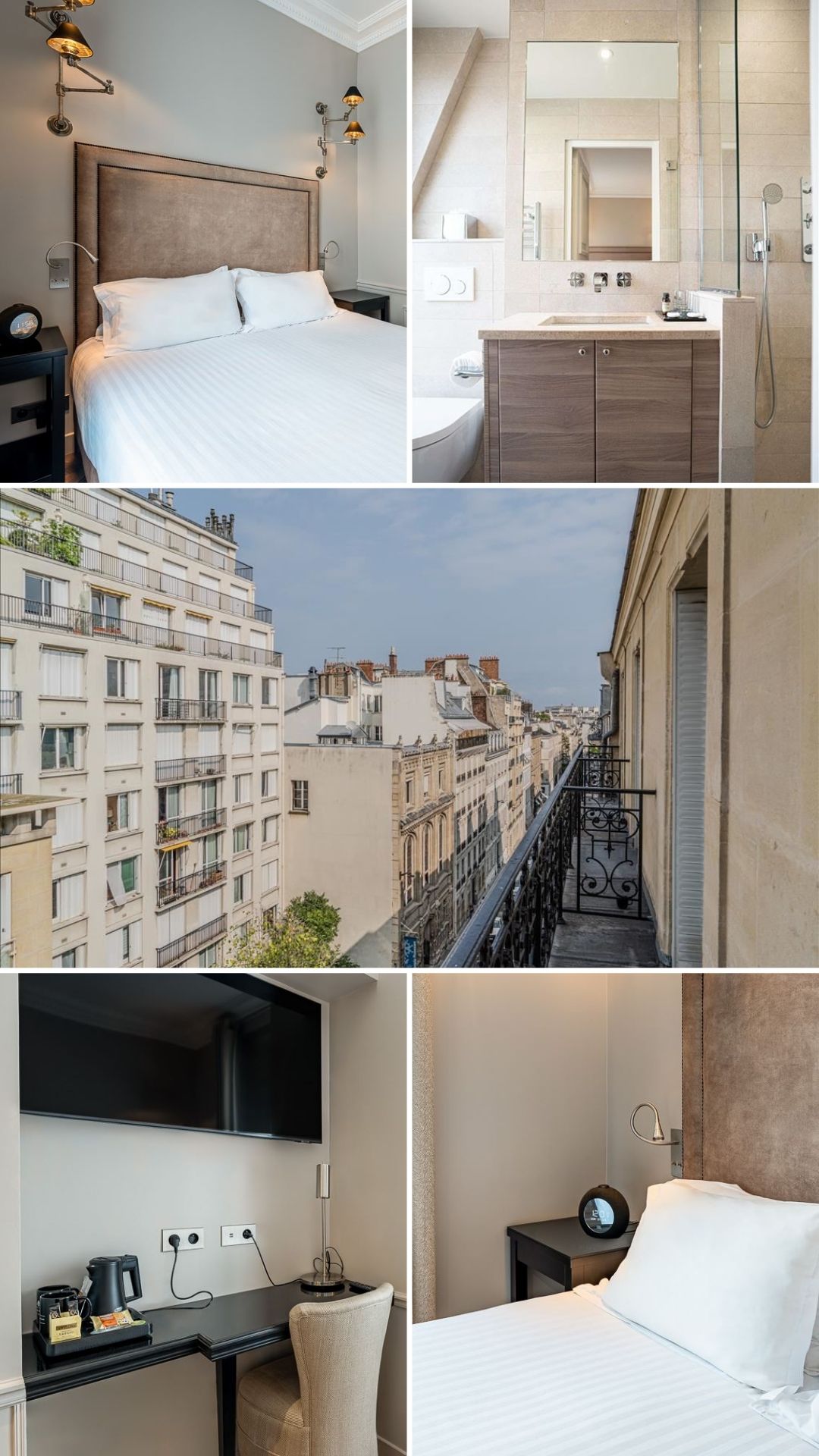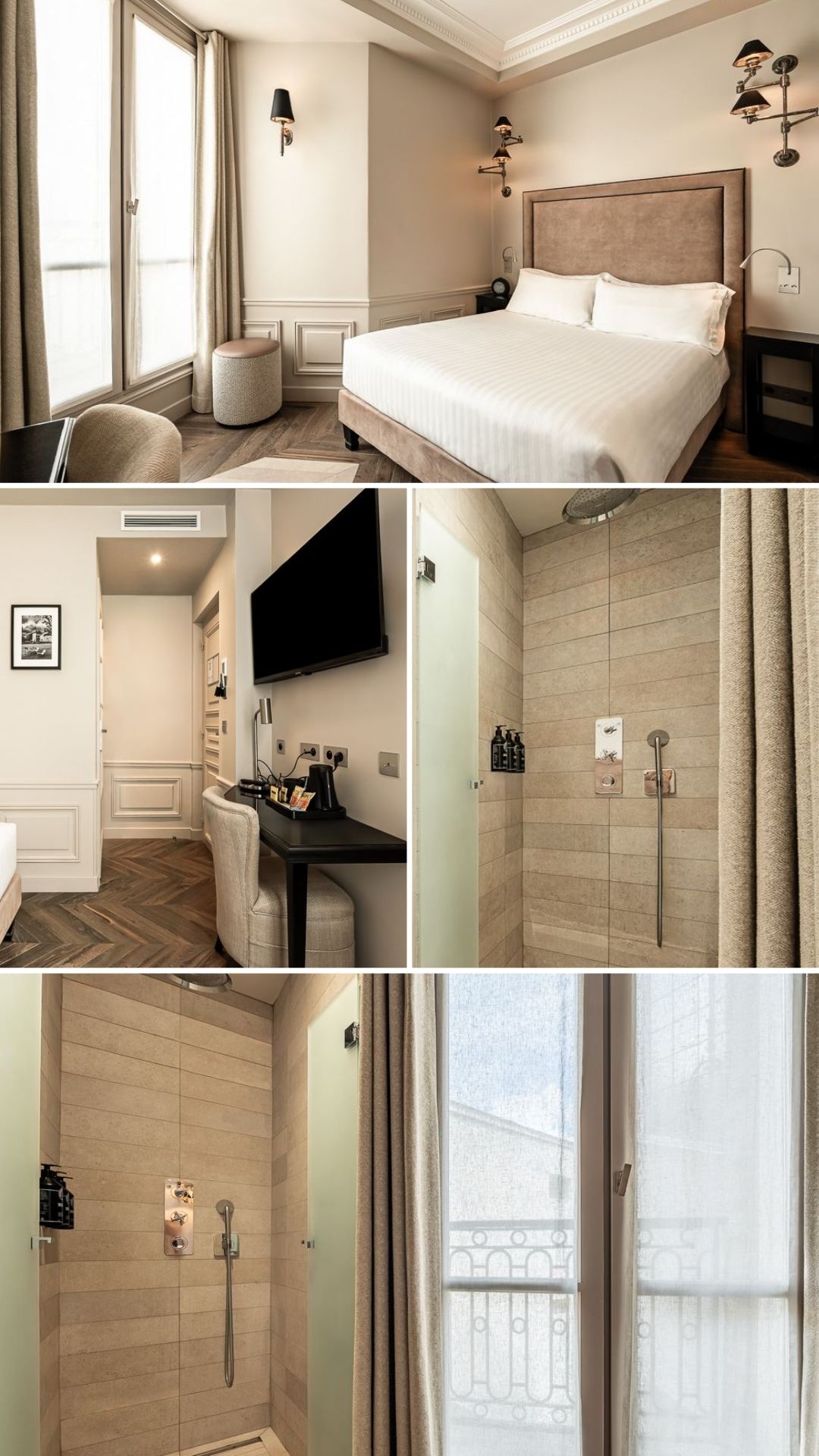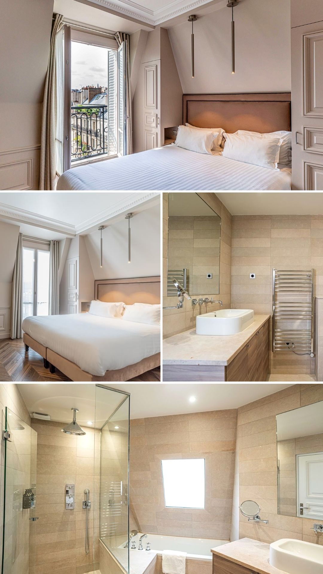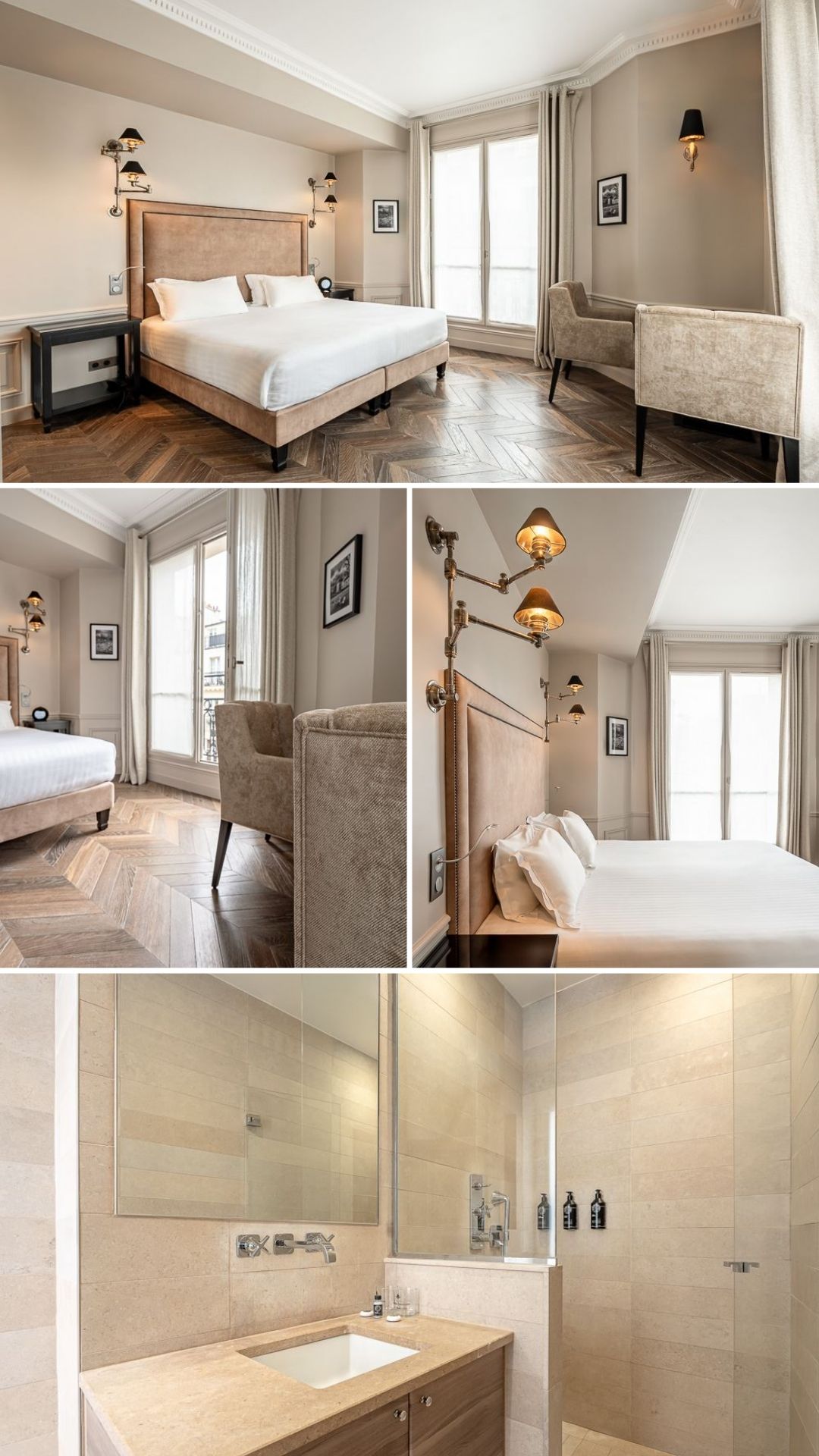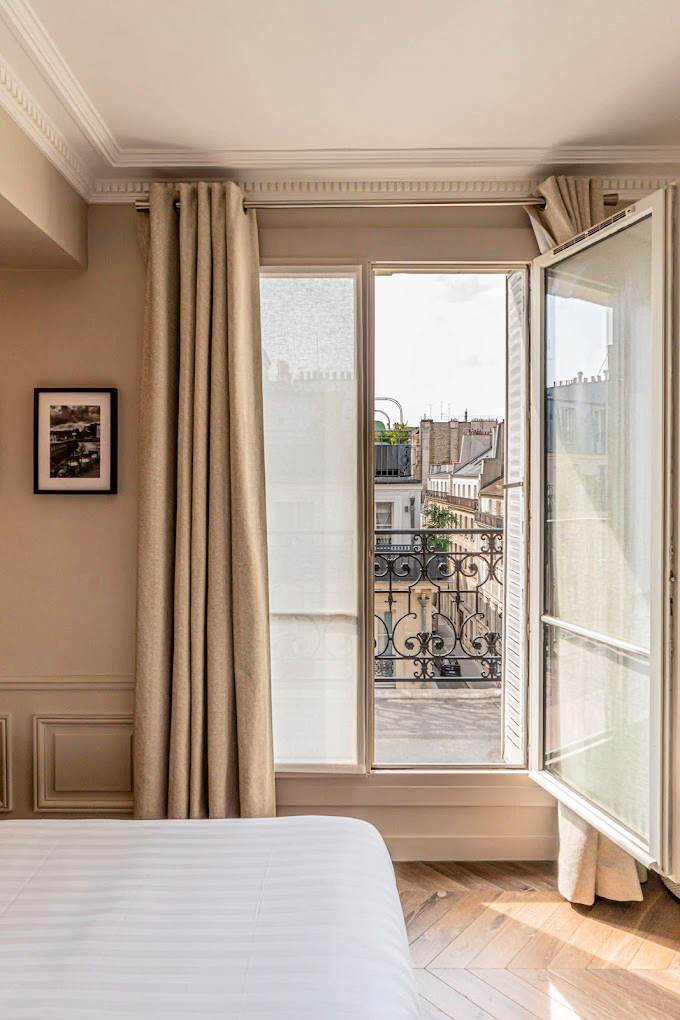 Les 24 chambres reflètent l’élégance parisienne : teintes douces, moulures, soubassements et parquet en chêne. Quelques chambres que l'on aime bien :