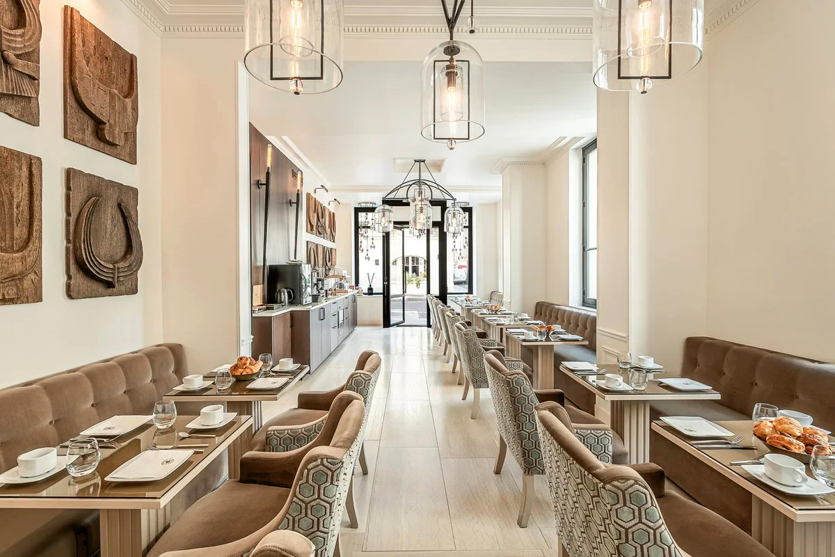 À l’intérieur, la réception moderne et feutrée donne le ton d’un séjour à la fois chic, calme et profondément parisien. Le personnel est particulièrement aimable, serviable et souriant.