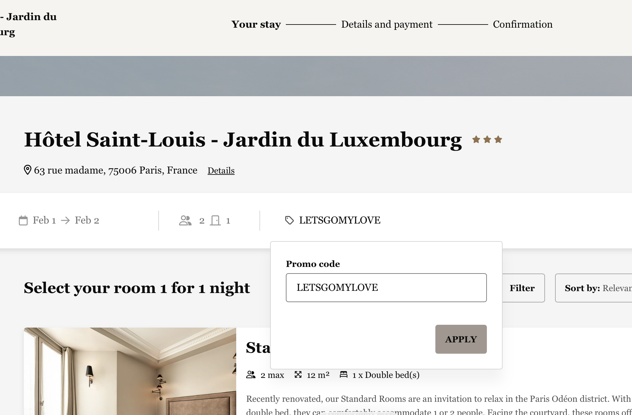 Tapez le code promo LETSGOMYLOVE en réservant sur le site officiel de notre partenaire et bénéficiez de -5% sur votre séjour. Regardez cette image pour voir où taper le code.
