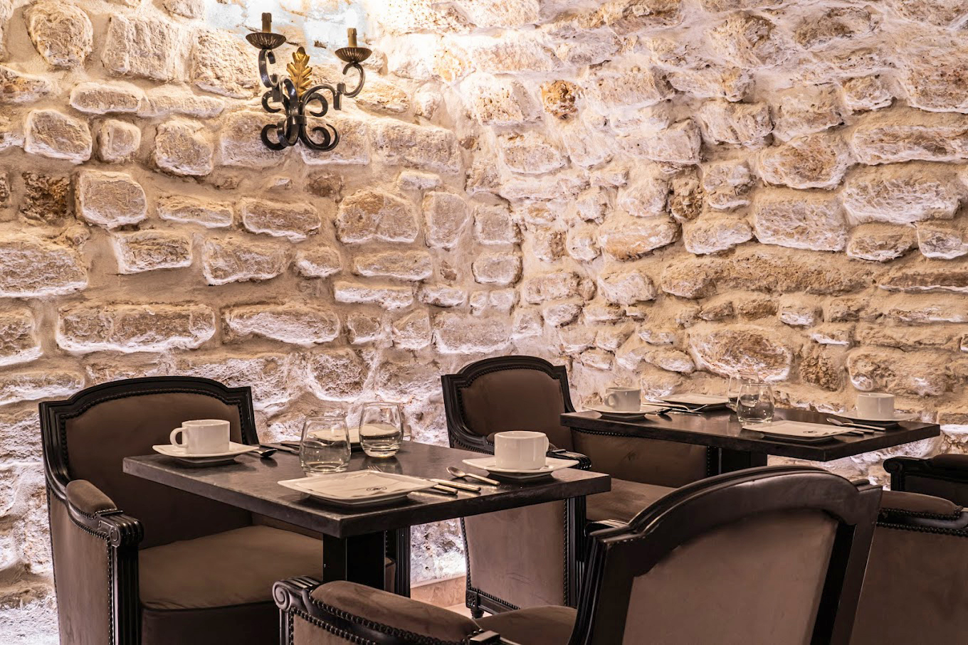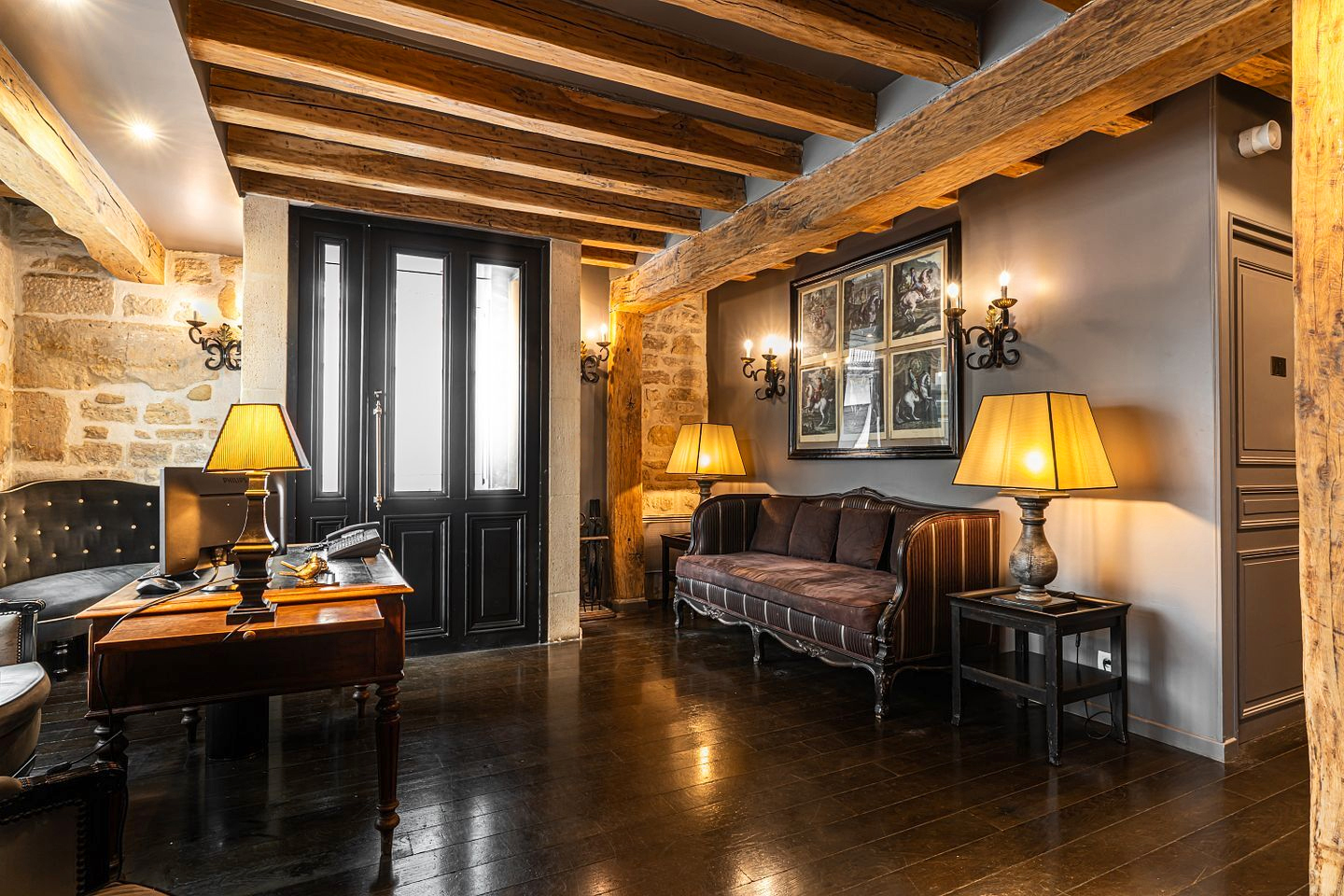 Poussez la porte pour découvrir un hall chaleureux avec larges poutres en bois, murs en pierre apparente et une lumière douce. La décoration est soignée et rappelle les anciennes demeures parisiennes. L’accueil est simple et attentionné.