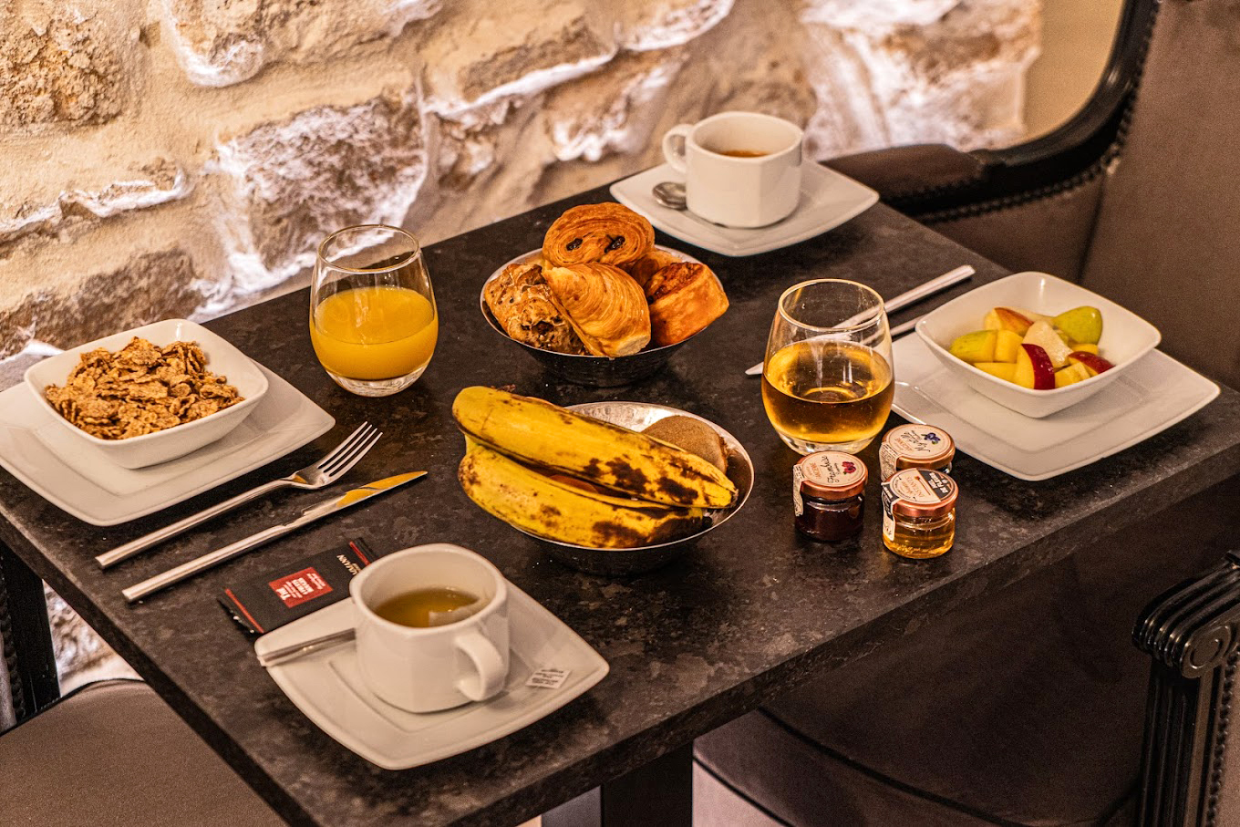 Au petit matin, entre 7h30 et 10h30, rendez-vous au sous-sol pour savourer votre petit-déjeuner dans la splendide cave voûtée en pierre naturelle. Servi sous forme de buffet, le petit-déjeuner est en option, au tarif de 30€ pour 2. Pour prolonger la magie du réveil à deux, le petit-déjeuner peut également, sur demande, être apporté en chambre.