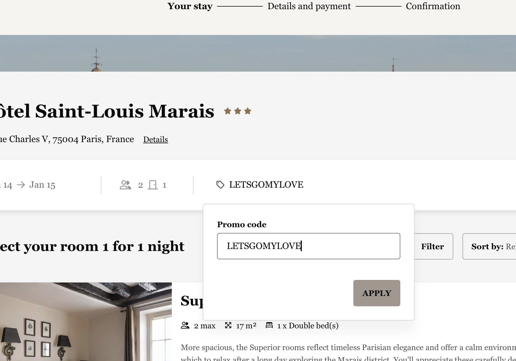 Tapez le code promo LETSGOMYLOVE en réservant sur le site officiel de notre partenaire et bénéficiez de -5% sur votre séjour. Regardez cette image pour voir où taper le code.