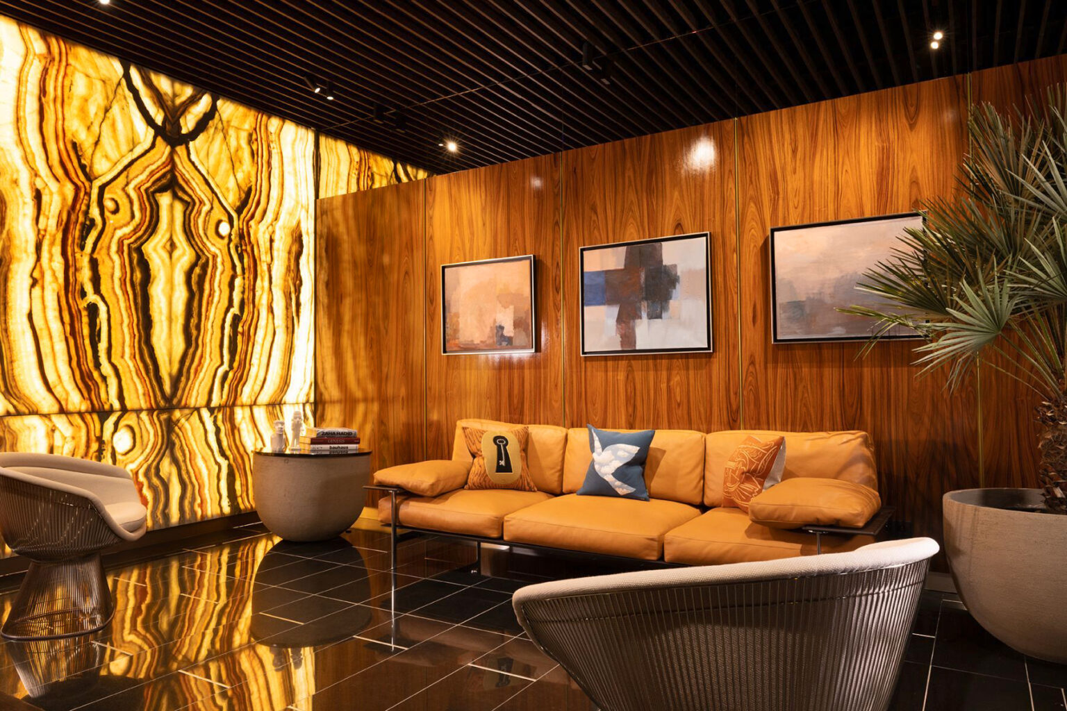 La façade de l'hôtel est très discrète. Pénétrez à l'intérieur et admirez le mur dans le lobby en pierre du brésil : de l'onyx. C'est ici la conciergerie et il y a toujours quelqu'un pour vous accueillir. Prenez l'ascenseur au 1er étage pour rejoindre la réception.