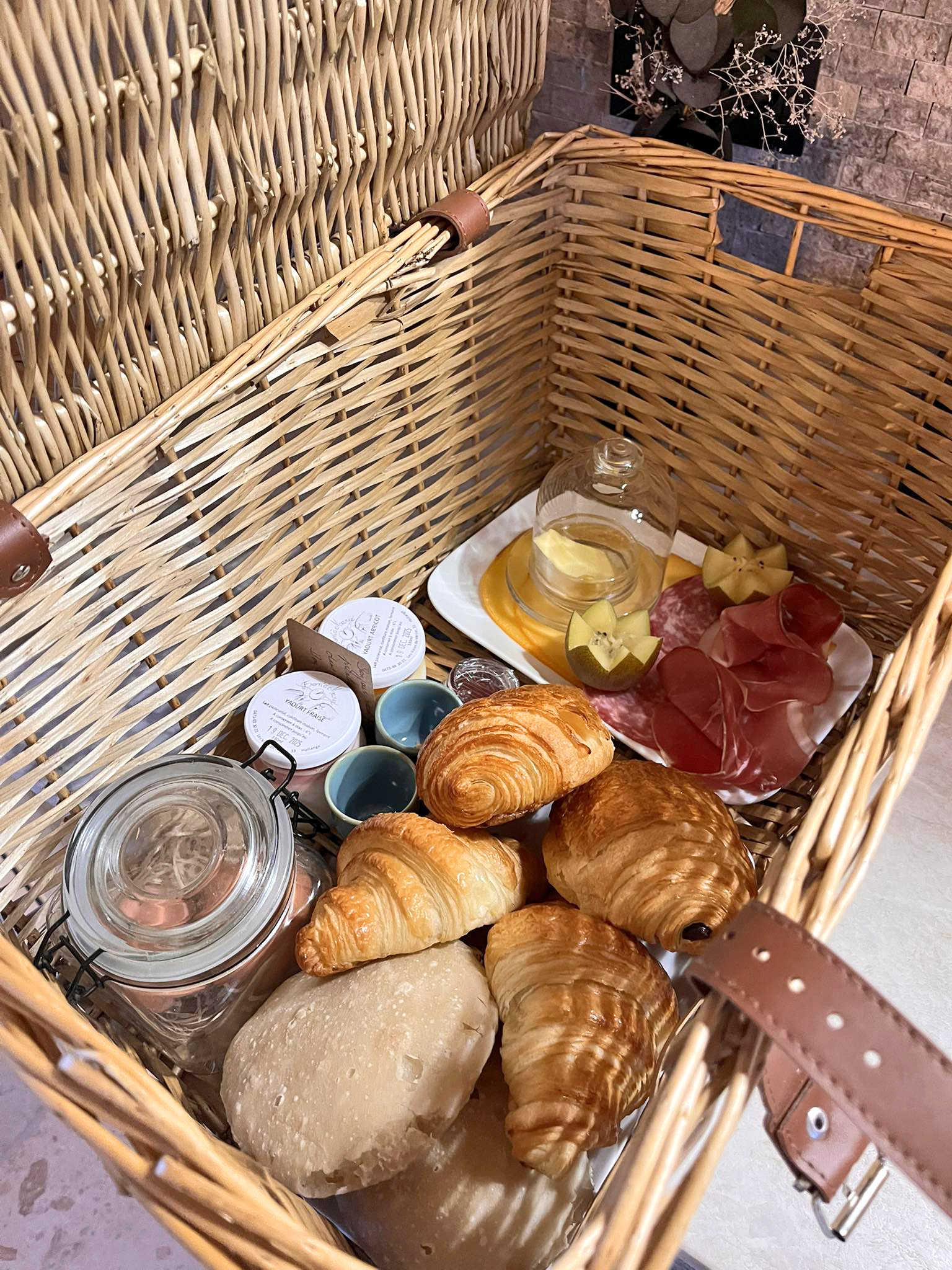 Au petit matin, un petit-déjeuner local et varié vous est proposé en option au prix de 40€ pour 2 personnes. Il est servi à l'heure de votre choix et arrive dans un petit panier en osier. À déguster sur la terrasse les beaux jours ou bien confortablement dans le canapé près du poêle à bois.