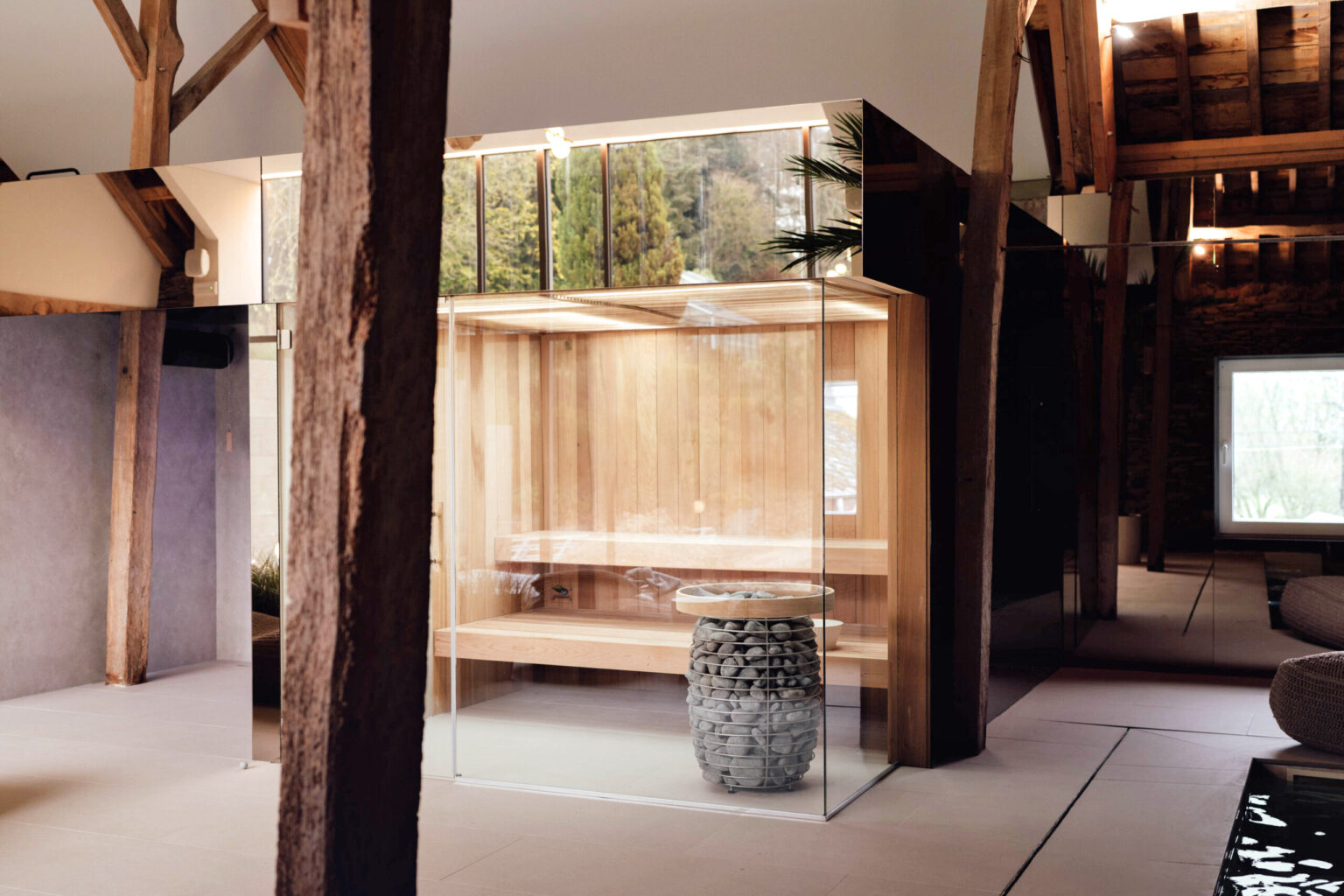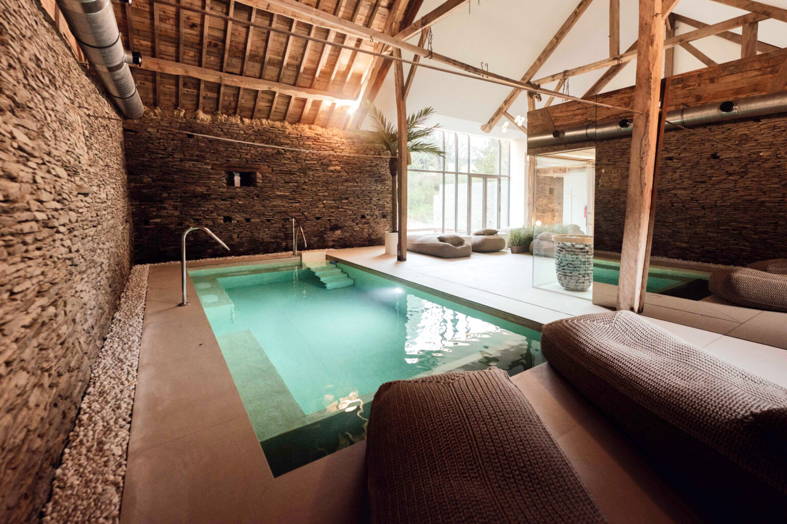 Oui, nichée sous une charpente en bois brut aux allures de grange rénovée, le spa allie modernité, pureté et authenticité brute. On adore ses murs en pierres, ses poutres apparentes et son immense baie vitrée qui rend l'endroit si lumineux. C'est parfait pour s'étendre au soleil sur les transats en maille. Profitez de l'immense jacuzzi, du sauna panoramique tout en bois clair et du hammam.