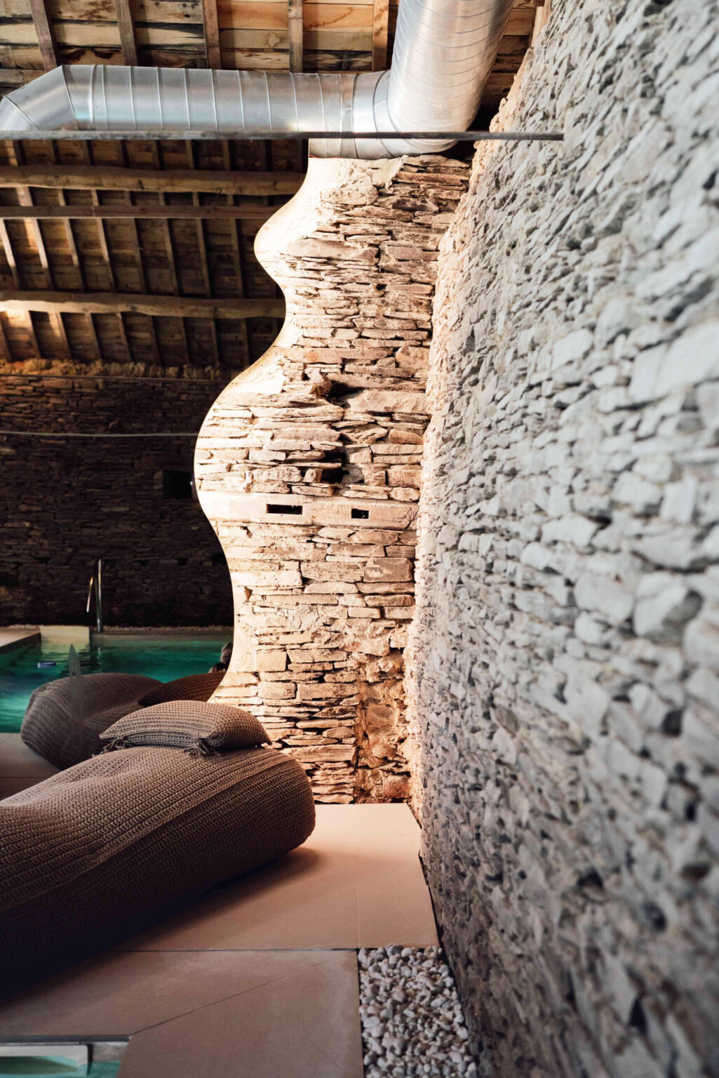 Niché au cœur du château, ce sanctuaire vous invite à une parenthèse de détente et de raffinement, où le temps semble suspendu. Il allie modernité, pureté et authenticité brute. On adore les pierres anciennes aux murs, les poutres et la grande baie vitrée qui rend l'endroit si lumineux.