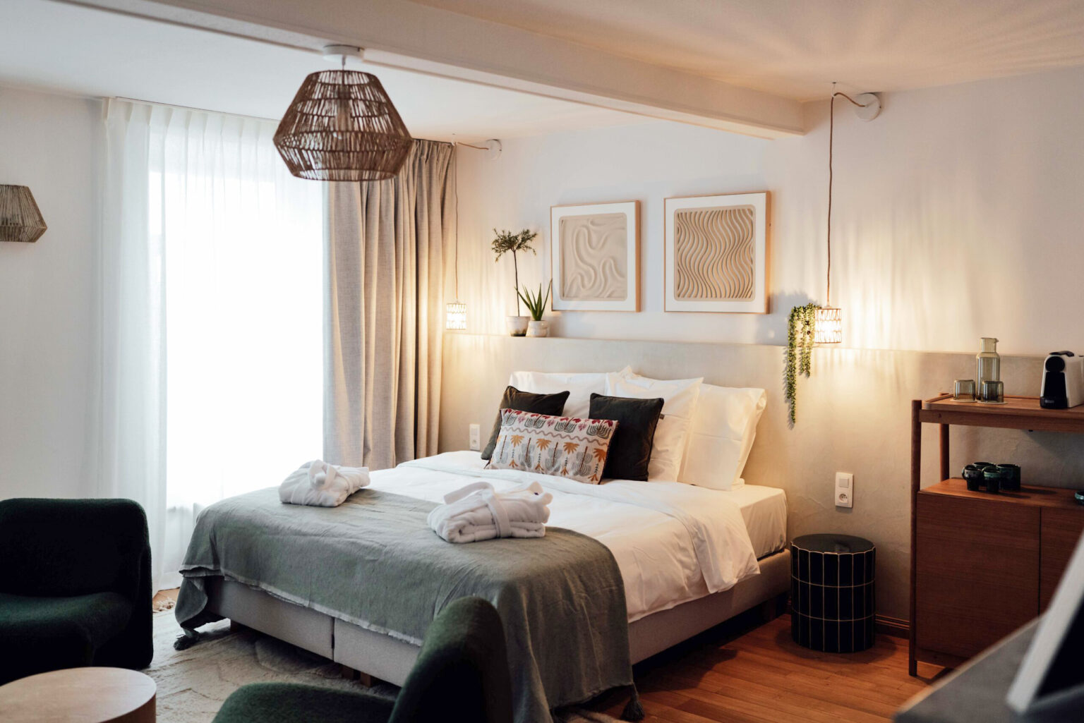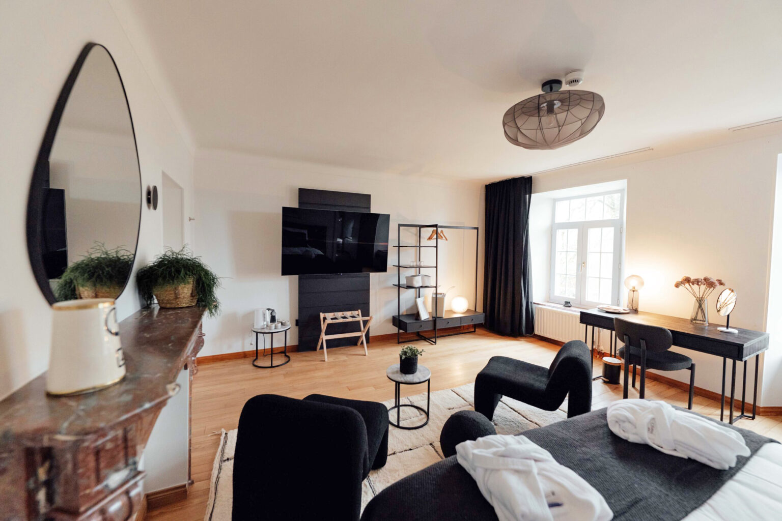 Selon la chambre choisie, vous disposez des équipements suivants : lit queen ou king-size, salle de bain avec douche, double douche ou baignoire, sèche-cheveux, produits d'accueil, pantoufles, peignoir, coin salon, Smart TV, cafetière et théière, chauffage, coffre-fort et Wi-Fi.