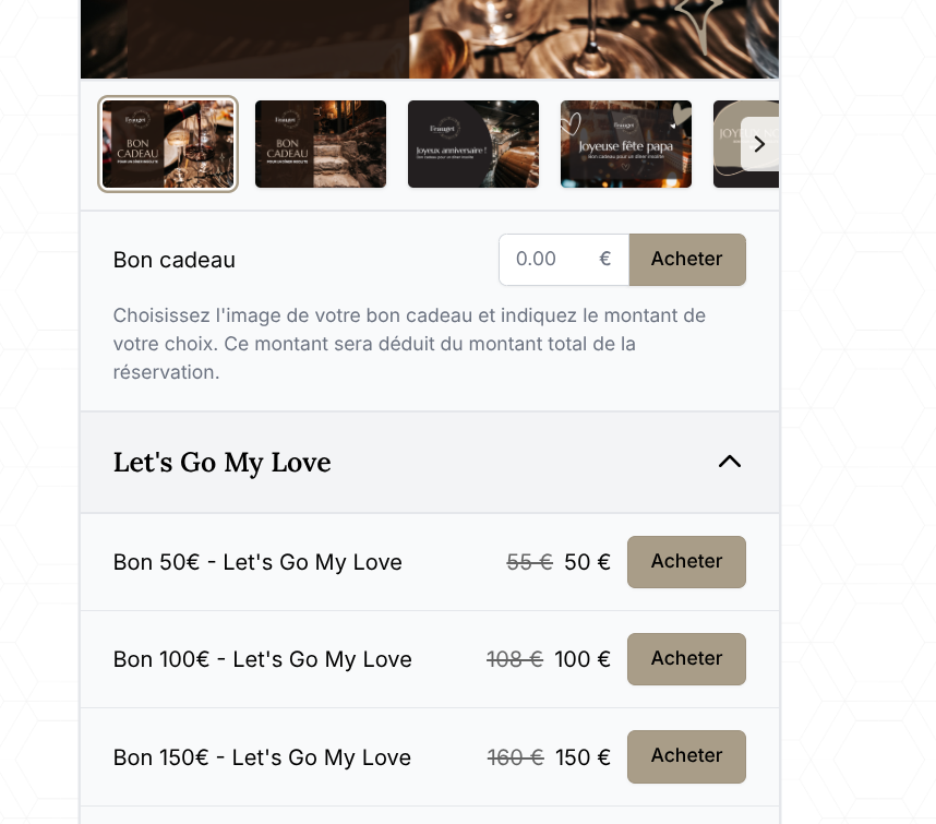 Tapez le code promo LETSGOMYLOVE au moment de réserver sur le site officiel de notre partenaire et bénéficiez d'une réduction de -5% sur votre expérience. Le code est valable est aussi valable si vous achetez une carte cadeau. Regardez cette image pour voir à quel endroit nous mentionner.