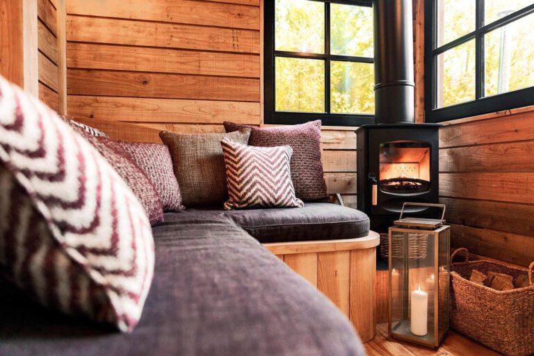 Selon la cabane choisie, vous disposez des équipements suivants : grand lit niché dans une alcôve en bois, salle de bain, douche en pierre bleue, cuisine équipée, espace salon avec grand canapé et poêle à bois, terrasse extérieure, baignoire (en cuivre, bois ou pierre), bain nordique, vue sur les collines ardennaises et barbecue. La décoration intérieure est colorée, cocooning et de très bon goût.
