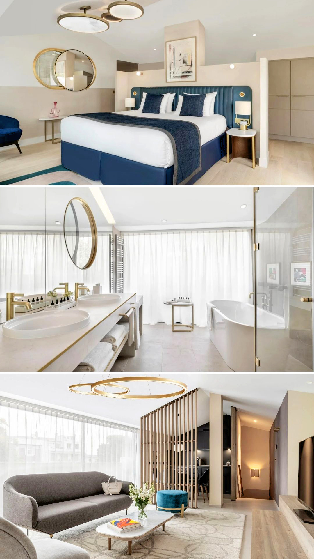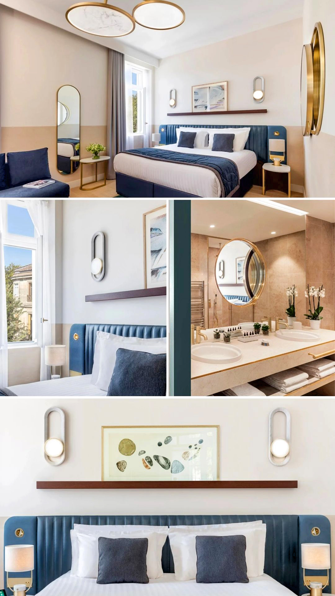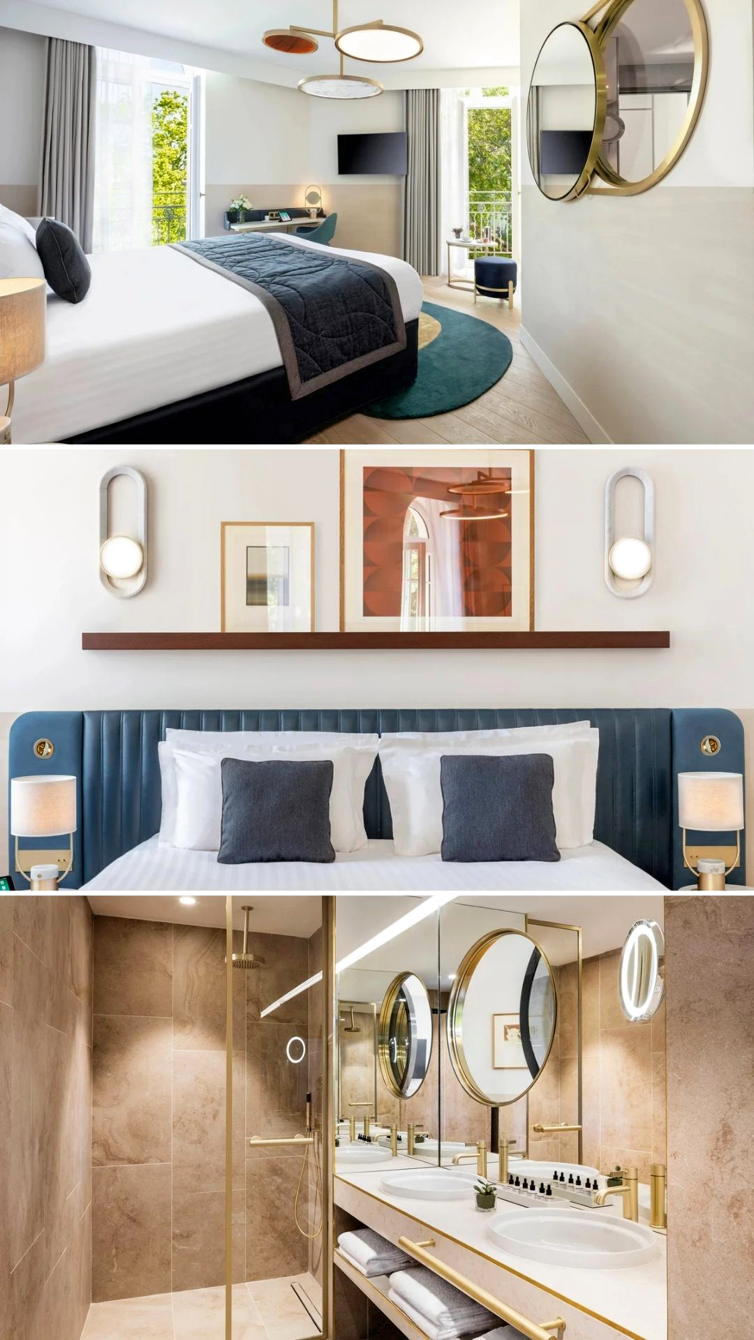 Selon la chambre choisie, vous bénéficiez des équipements suivants : literie king size, machine à café Nespresso, salle de bain avec douche à l'italienne et/ou baignoire, produits d’accueil de chez Codage, climatisation, coffre-fort, Smart TV, balcon, terrasse et vue sur jardin. On a un faible pour le miroir-hublot amovible dans la salle de bain.