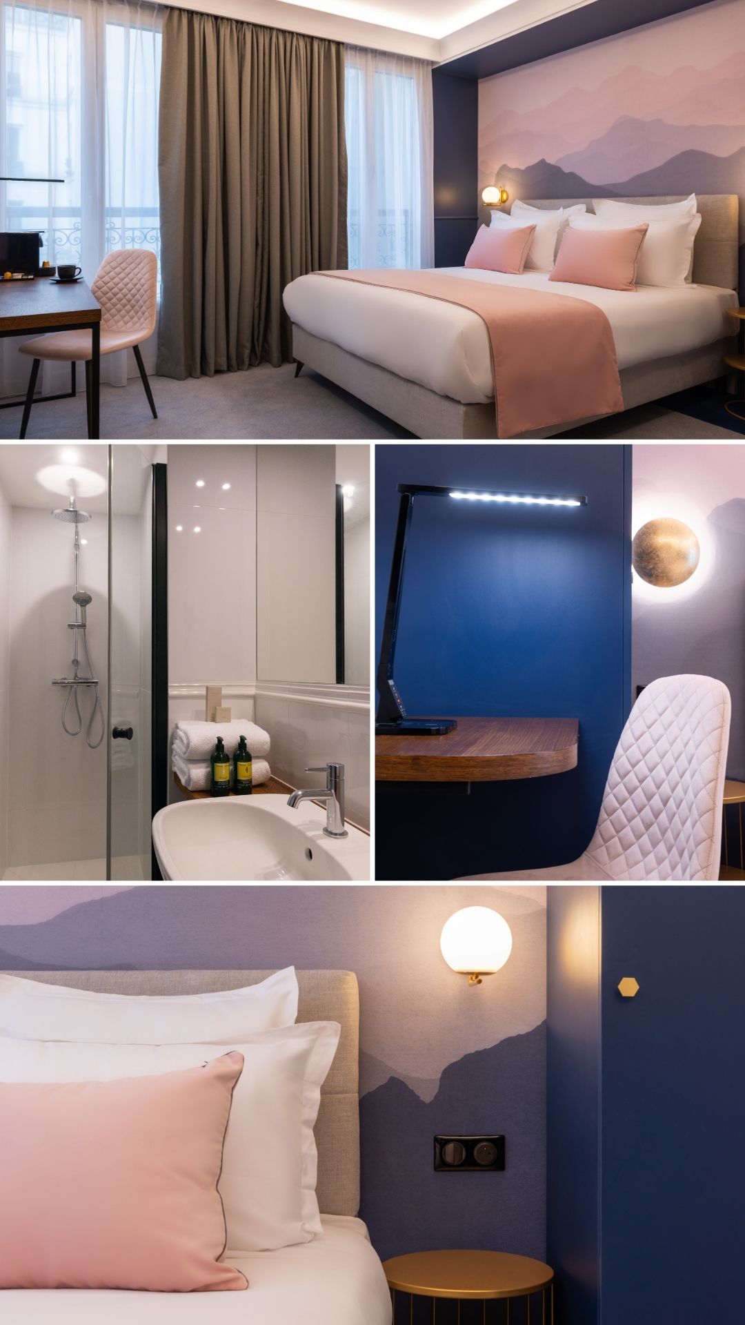 Selon la chambre choisie, vous bénéficiez des équipements suivants : lit queen size, balcon avec vue sur les toits parisiens, mini-bar, salle de bain douillette, capsules de douche de chez Skinjay, mobilier sur mesure et fauteuils en velours. Deux chambres sont accessibles aux personnes à mobilité réduite.