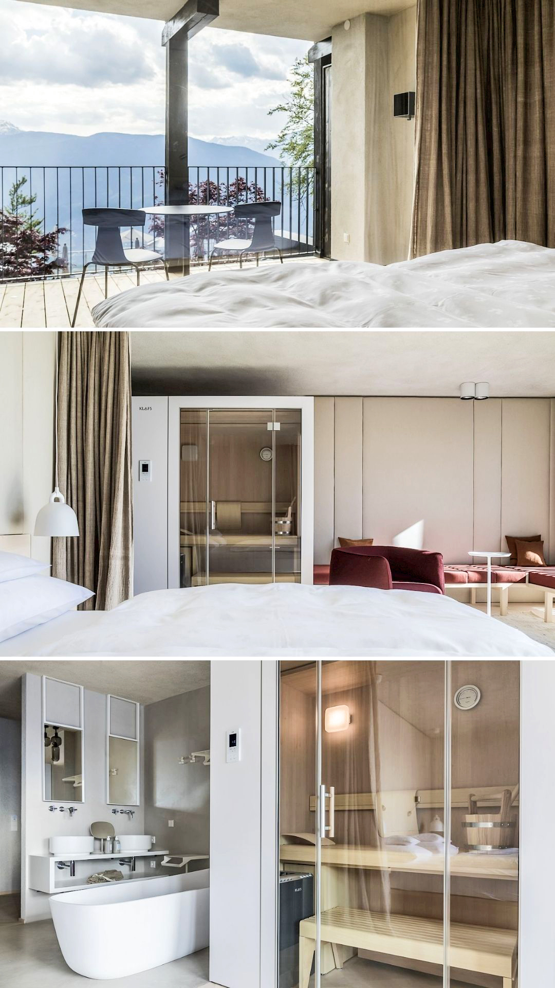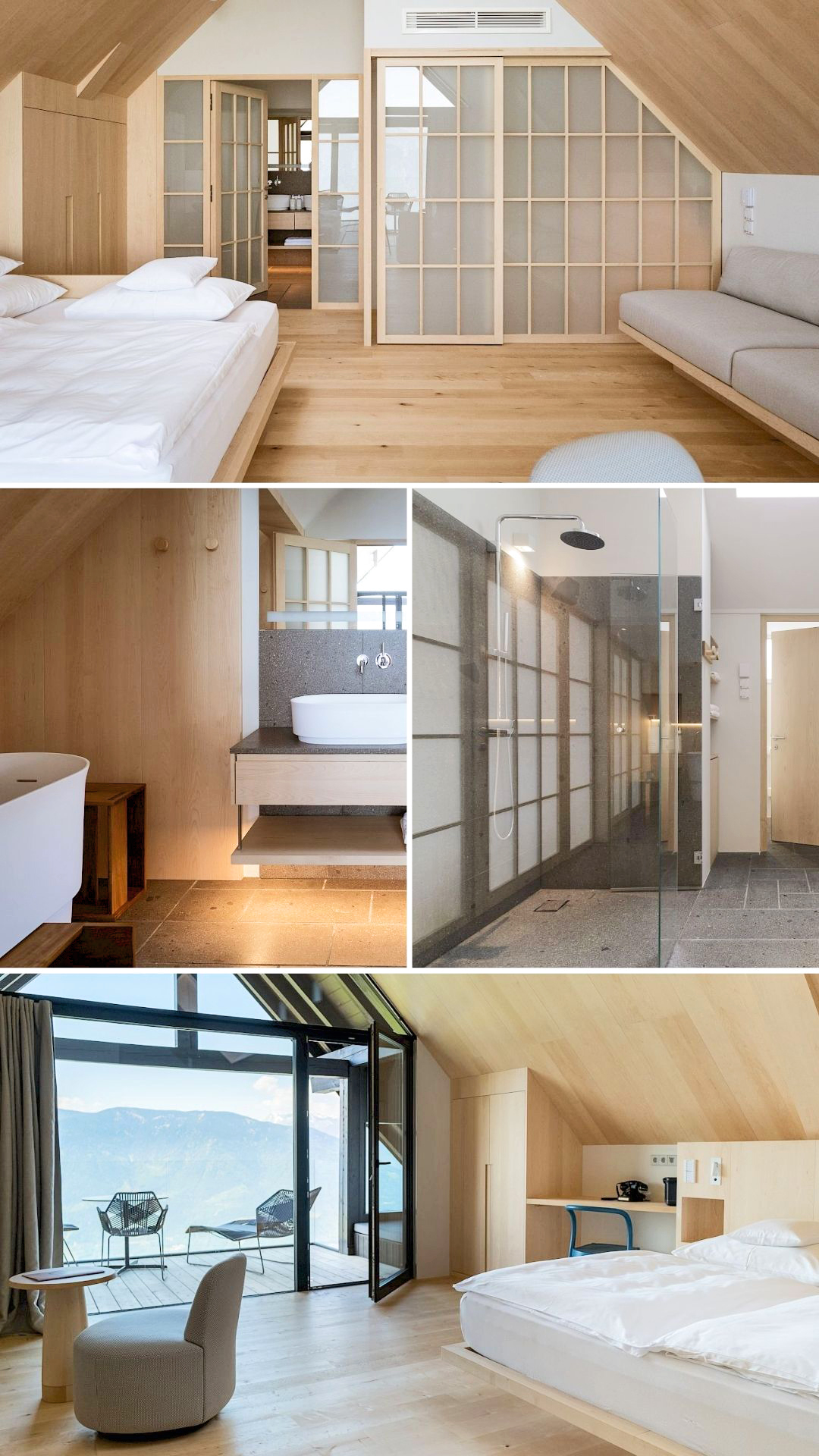 Selon la chambre choisie, vous disposez des équipements suivants : lit de chez Hästens, terrasse couverte ou balcon orienté au sud, jardin sur le toit, jacuzzi, sauna finlandais, douche extérieure chauffée, baie vitrée, chaises longues en bois, salle de bain avec douche à l’italienne, baignoire îlot, plancher en bois à chevrons et lampes Mössmer originales du designer sud-tyrolien Debiasi Sandri.