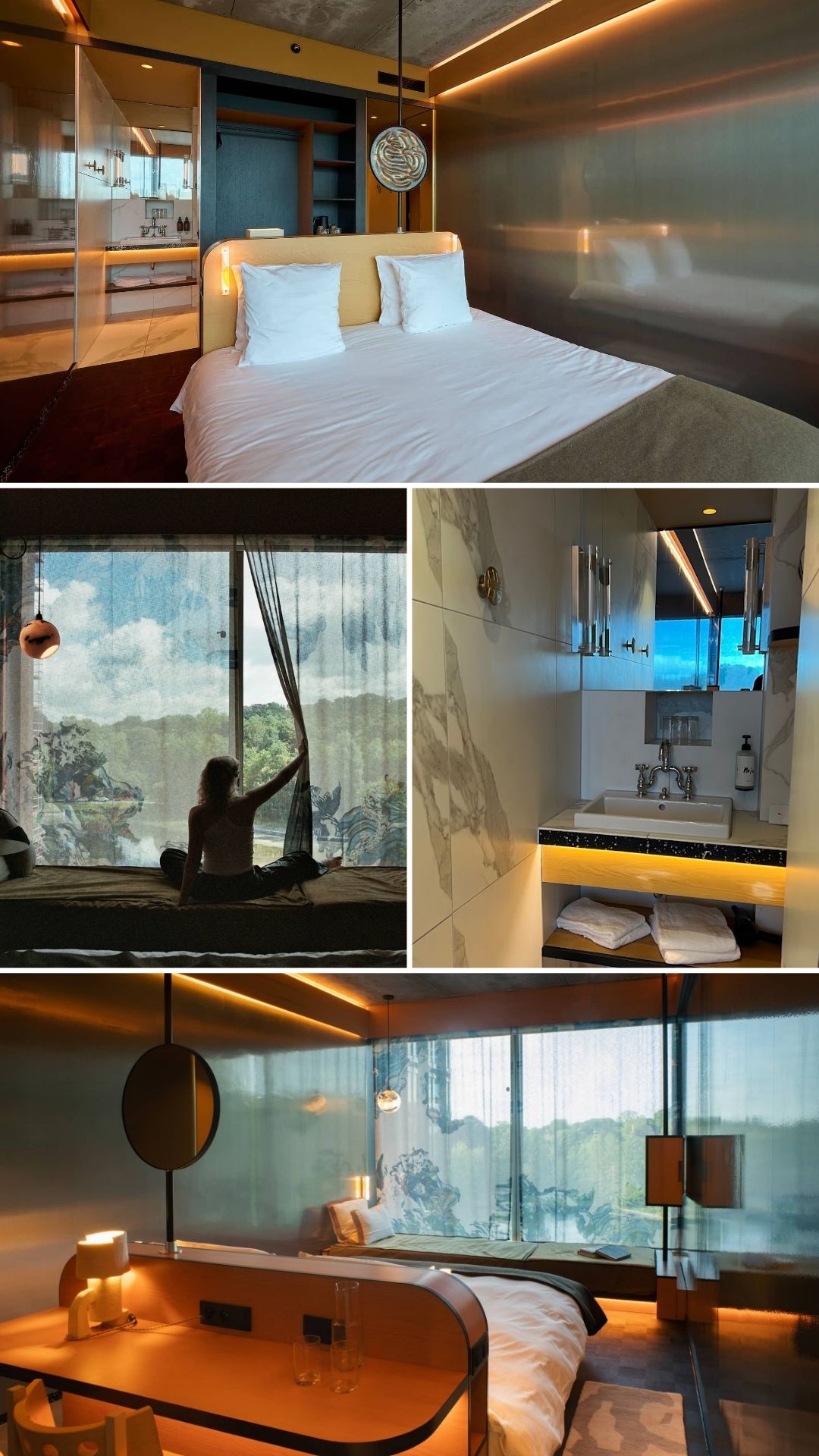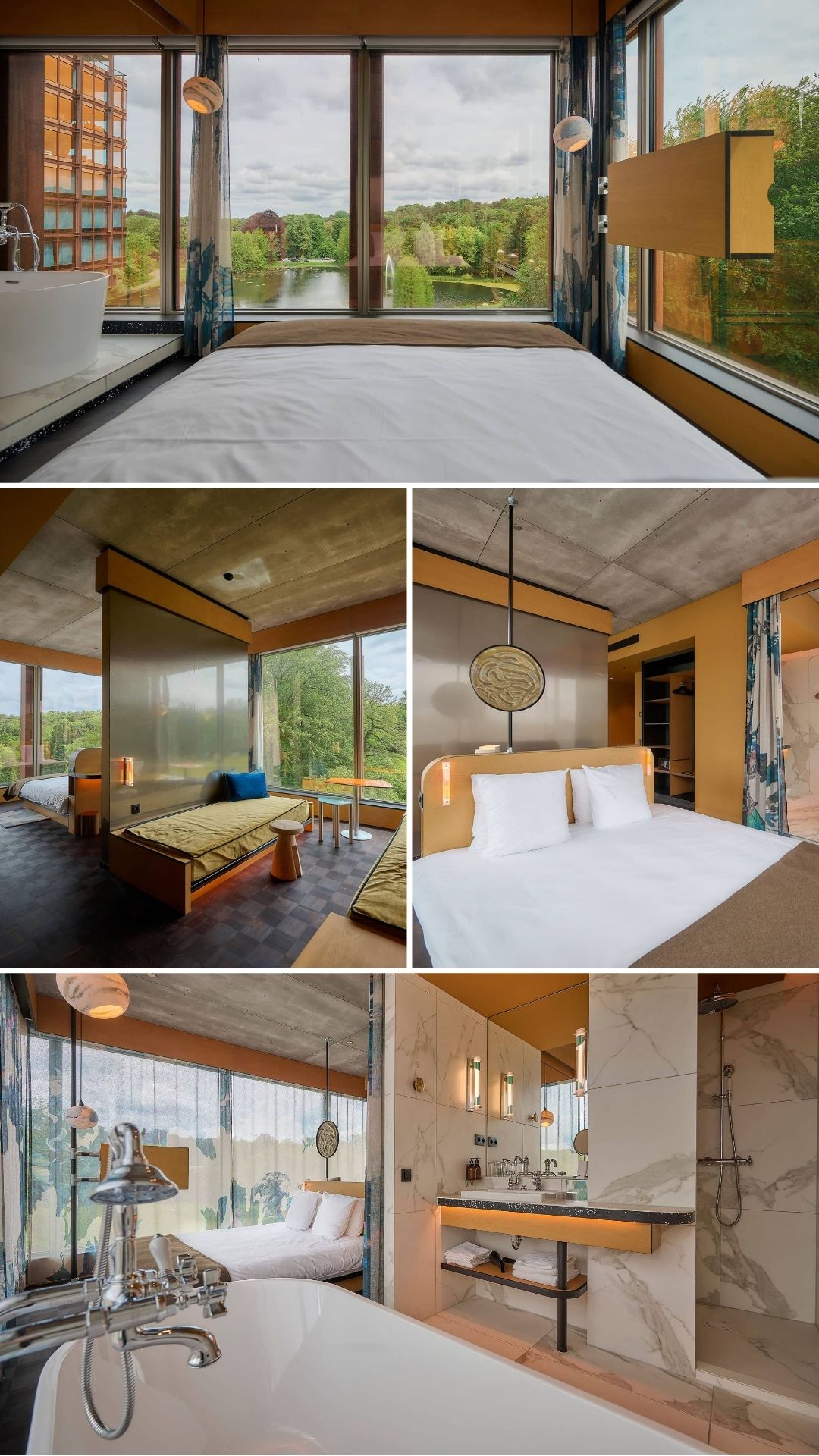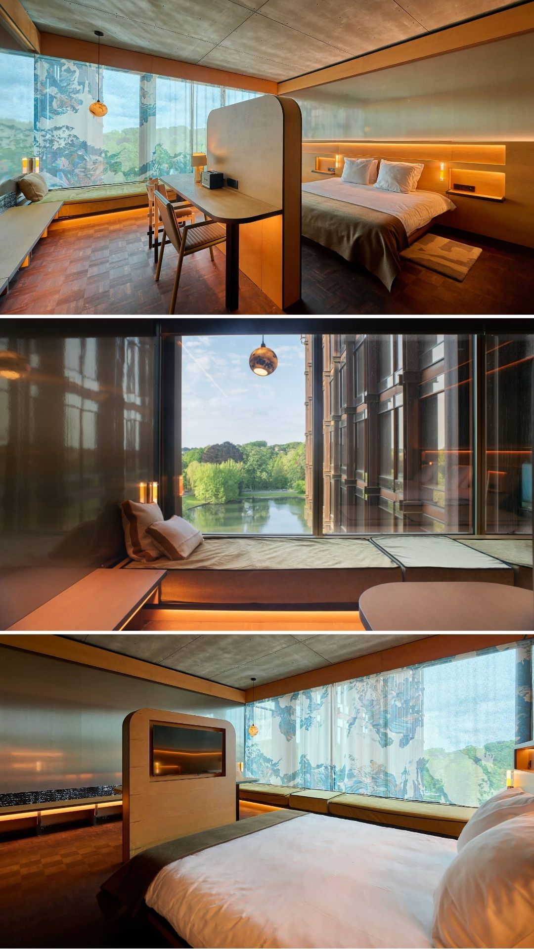 Nos chambres préférées ? Celles qui sont situées à l'extrémité de chaque branche de la structure en croix de l'hôtel. Car elles disposent de 4 fenêtres au lieu de 2 fenêtres, ce qui vous offre une splendide vue panoramique sur la nature environnante. Et si vous voulez plus d'espace et une cuisine équipée pour vous faire à manger, optez pour un studio.