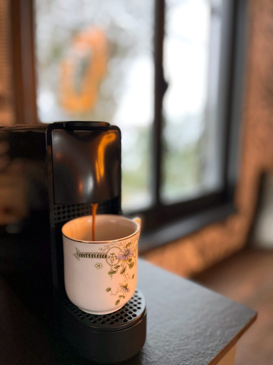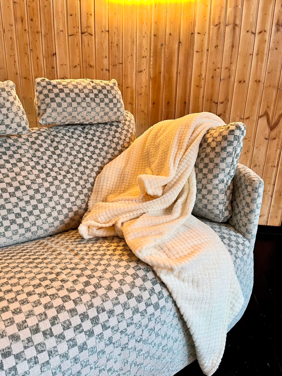 L'intérieur moderne de 50m² comprenant un séjour, une cuisine équipée, une chambre à coucher et une salle de bain. Voici les équipements à votre disposition : lit queen size avec draps de lit fournis, fauteuil relax XXL avec télécommande pour l'agrandir et poser vos jambes, enceinte bluetooth, machine à café Nespresso (avec nombreuses capsules) et appareil à raclette. La décoration intérieure est très cocooning.