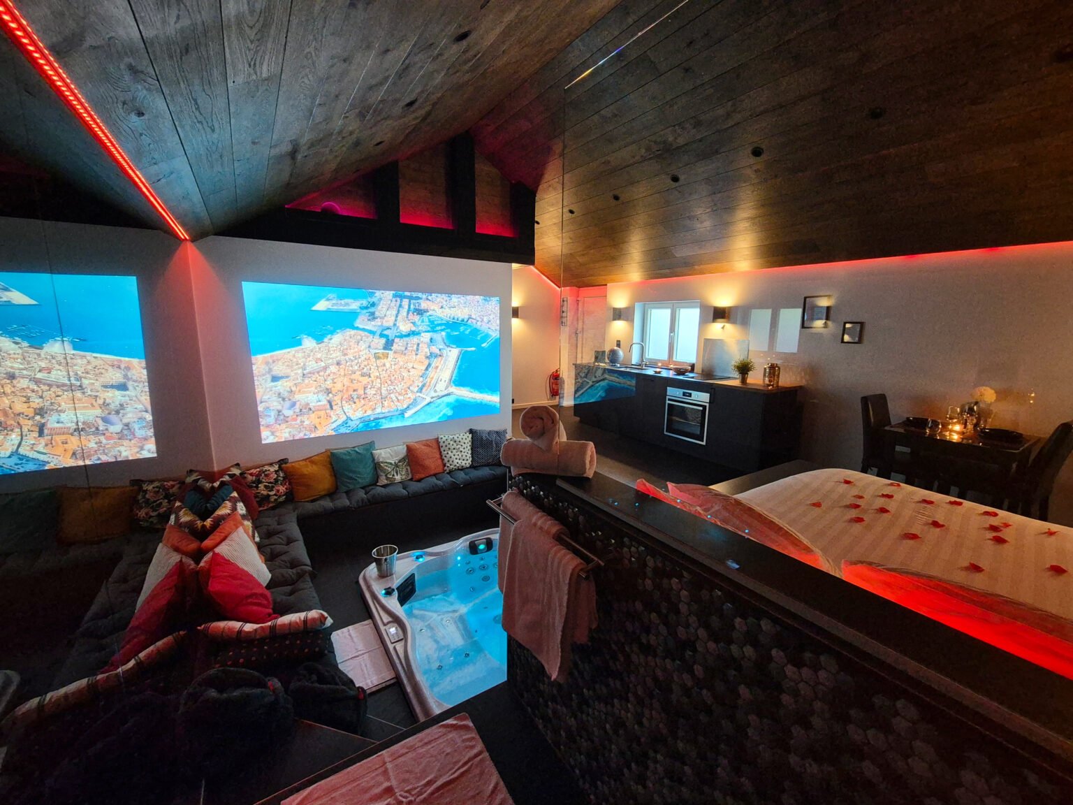 Selon la suite choisie, vous bénéficiez des équipements suivants : lit douillet king size, vidéo projecteur cinéma professionnel connecté à Apple TV, cuisine équipée, salle à manger, jacuzzi privatif, piscine privative, sauna et superbe vue sur la forêt.