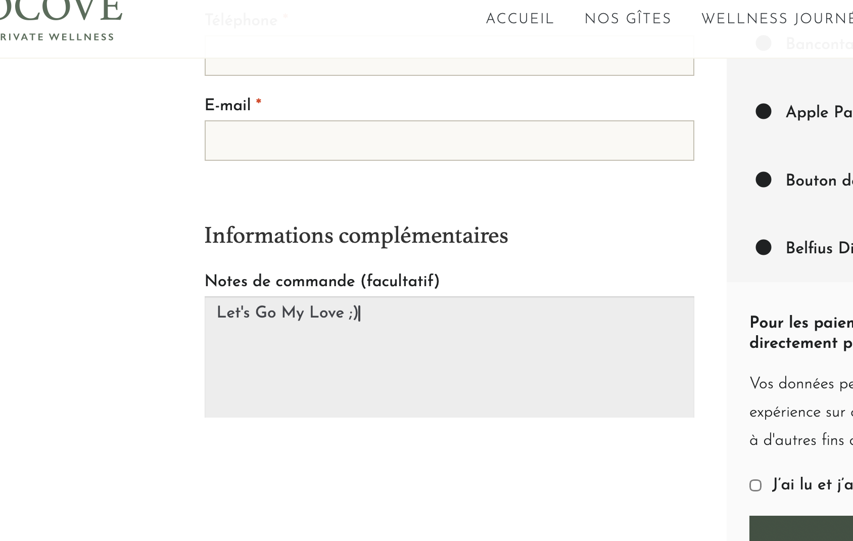 Mentionnez Let's Go My Love au moment de réserver votre séjour en amoureux sur le site officiel de notre partenaire et profitez d'un départ tardif à 12h au lieu de 11h. Regardez cette capture d'écran pour voir où nous mentionner. Cela marche aussi par téléphone ou mail.