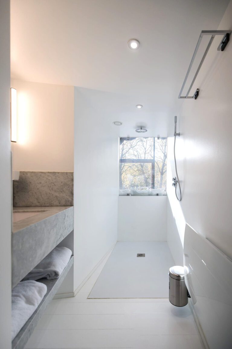 Pas de baignoire mais une grande douche à l'italienne avec ouverture transparente vers la grande baie vitrée de la tente.