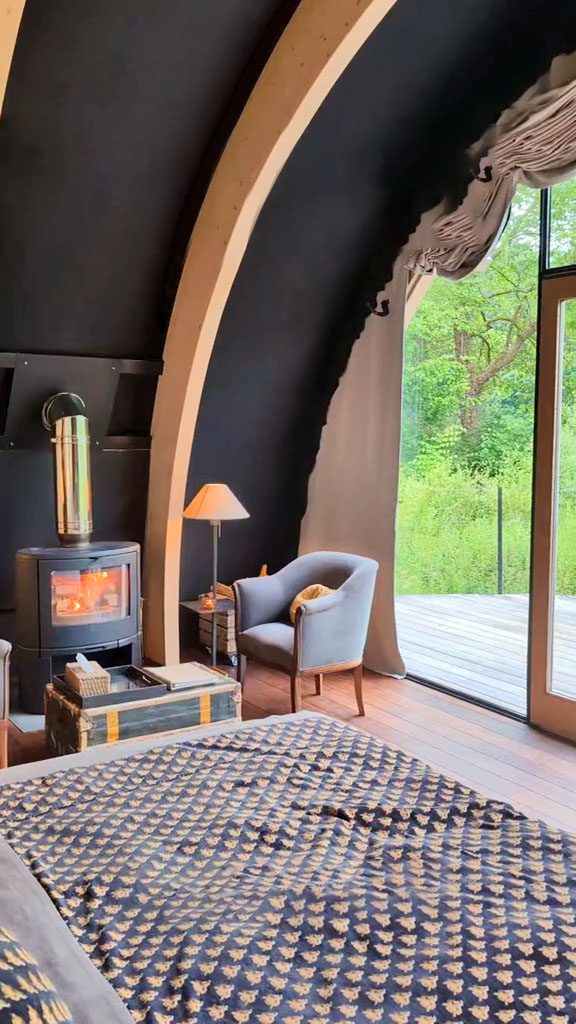 Lorsqu'il pleut ou qu'il neige à l'extérieur, profitez de la délicieuse ambiance cocooning à l'intérieur... Il y a un poêle à bois pour faire un feu (attention la surface peut bien chauffer, il y a une petite trousse de secours dans la tente si besoin) mais aussi des plaids si vous avez froid, des parapluies, une enceinte bluetooth, des bougies et une Smart TV avec Netflix et Prime Vidéo.