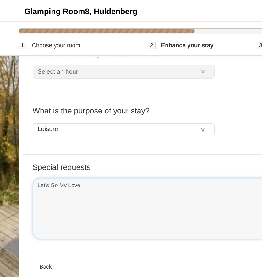 Mentionnez Let's Go My Love au moment de réserver sur le site officiel de notre partenaire et recevez une bouteille offerte à votre arrivée. Vous pouvez demander une alternative sans alcool si vous préférez. Regardez cette image pour voir où mentionner Let's Go My Love.