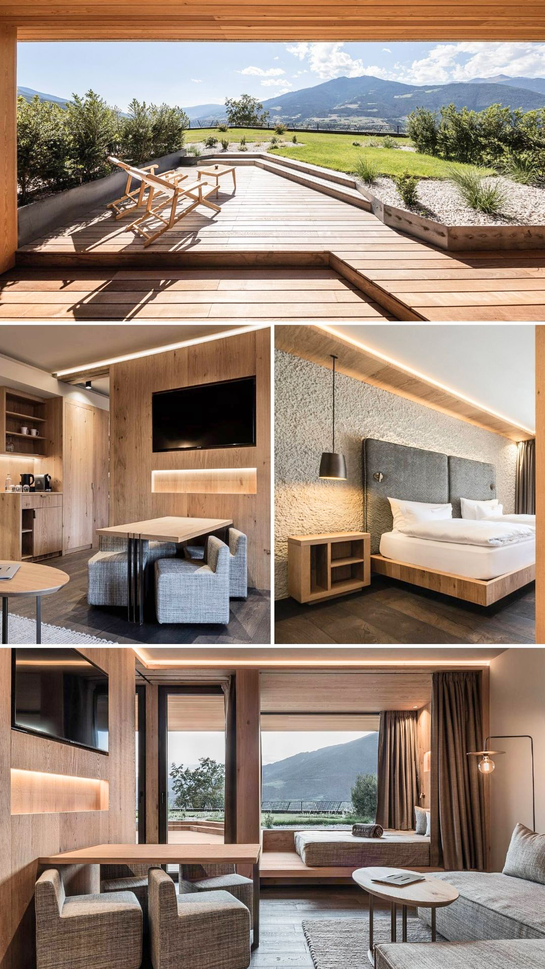 En dehors des piscines : un lounge très cocooning avec vue sur les montagnes, plusieurs saunas, un hammam et un jacuzzi.