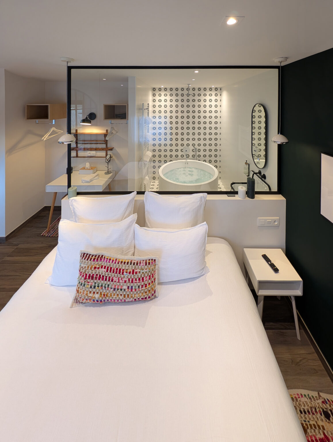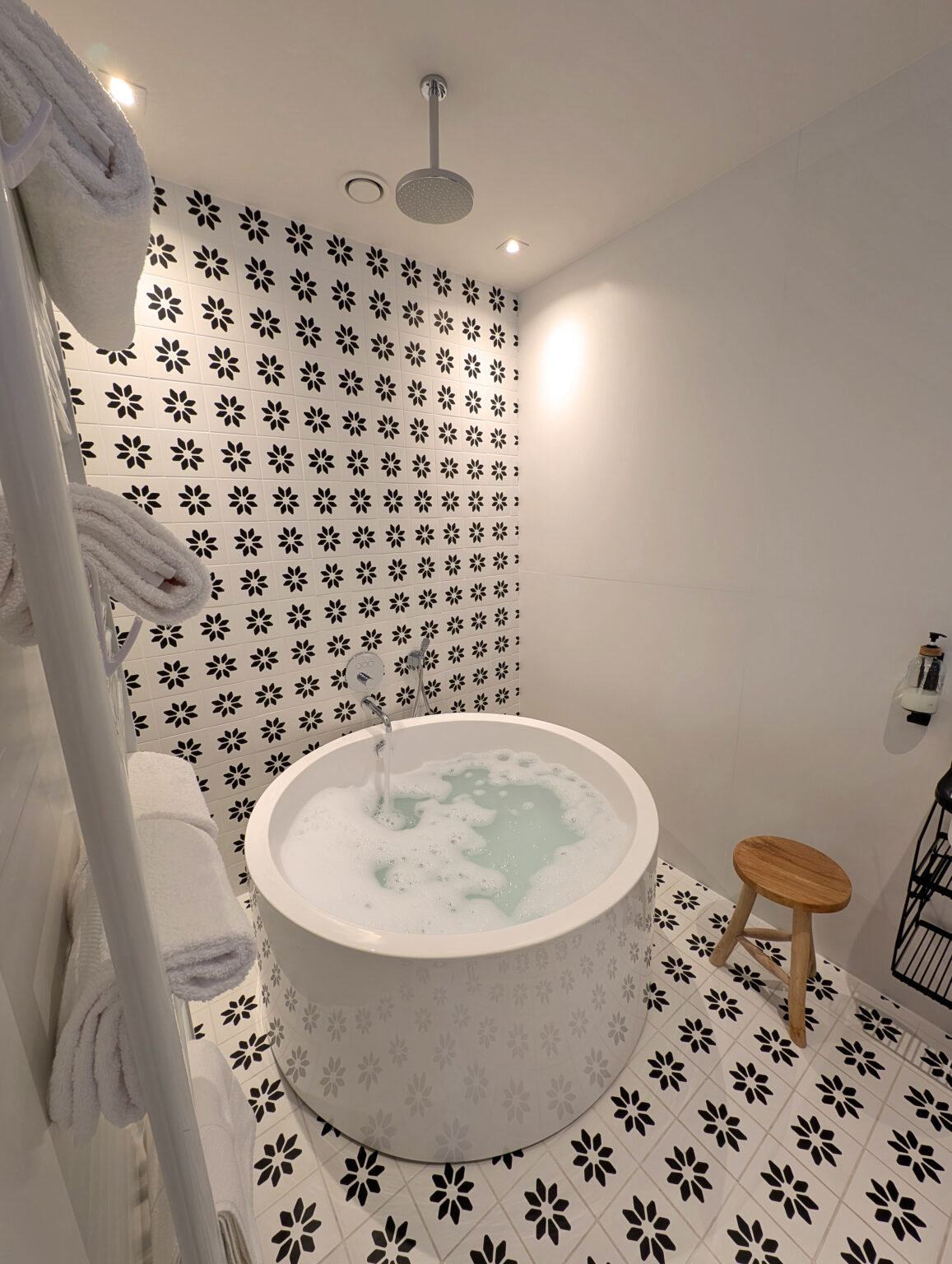 Notre suite préférée est la n°1 avec sa verrière, sa terrasse privative à l'arrière et sa douche au top. La n°2 arrive ensuite avec sa baignoire ronde et son canapé ultra cosy. La n°3 possède le plus grand canapé et la plus douche avec un mini bémol : elle est située à l'avant avec vue sur le parking. Mais franchement c'est très subjectif et les 3 suites se valent largement.
