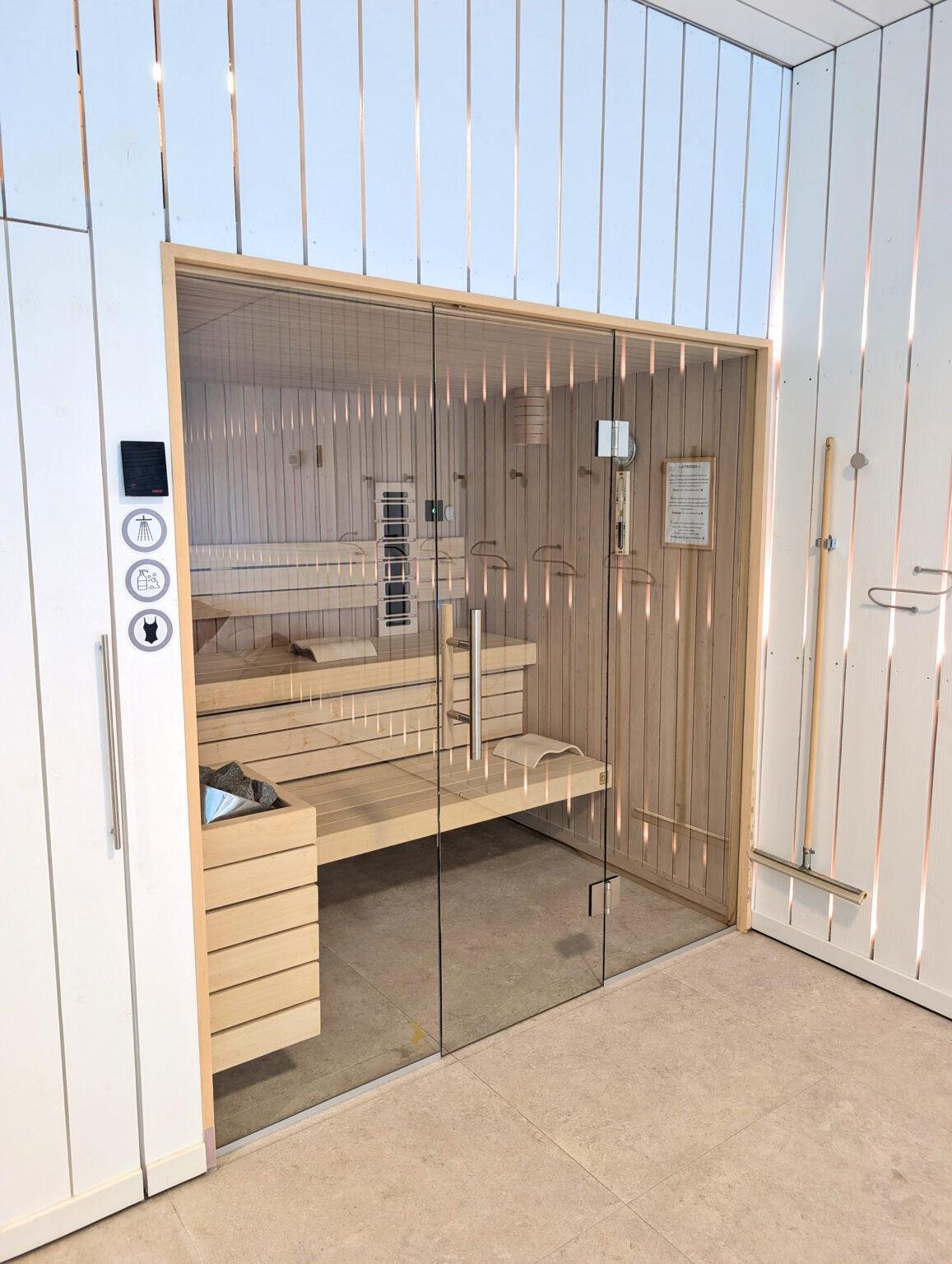 Lorsque vous dormez ici, vous avez la possibilité de réserver un créneau dans le wellness. Au programme : piscine chauffée à 32° avec jet massant et nage à contre-courant, sauna aux pierres de lave, douche finlandaise, transats confortables et terrasse extérieure orientée plein sud. C'est bien chauffé, cocooning et très agréable.