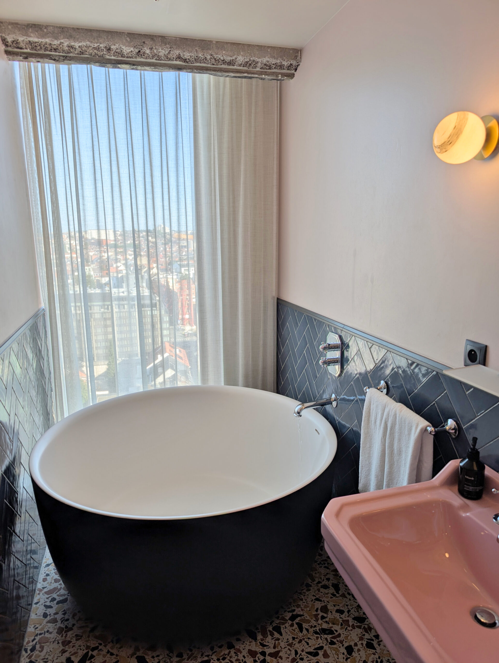 On a eu l'occasion de dormir ici (dans la chambre n°1902) et c'était une nuitée absolument agréable. Ce qu'on a préféré : le rooftop au sommet qui est vraiment sensationnel et spacieux, la décoration vintage très réussie et la chambre qui était pratiquement parfaite. Voici une photo de notre chambre et une autre photo de la baignoire hyper agréable.