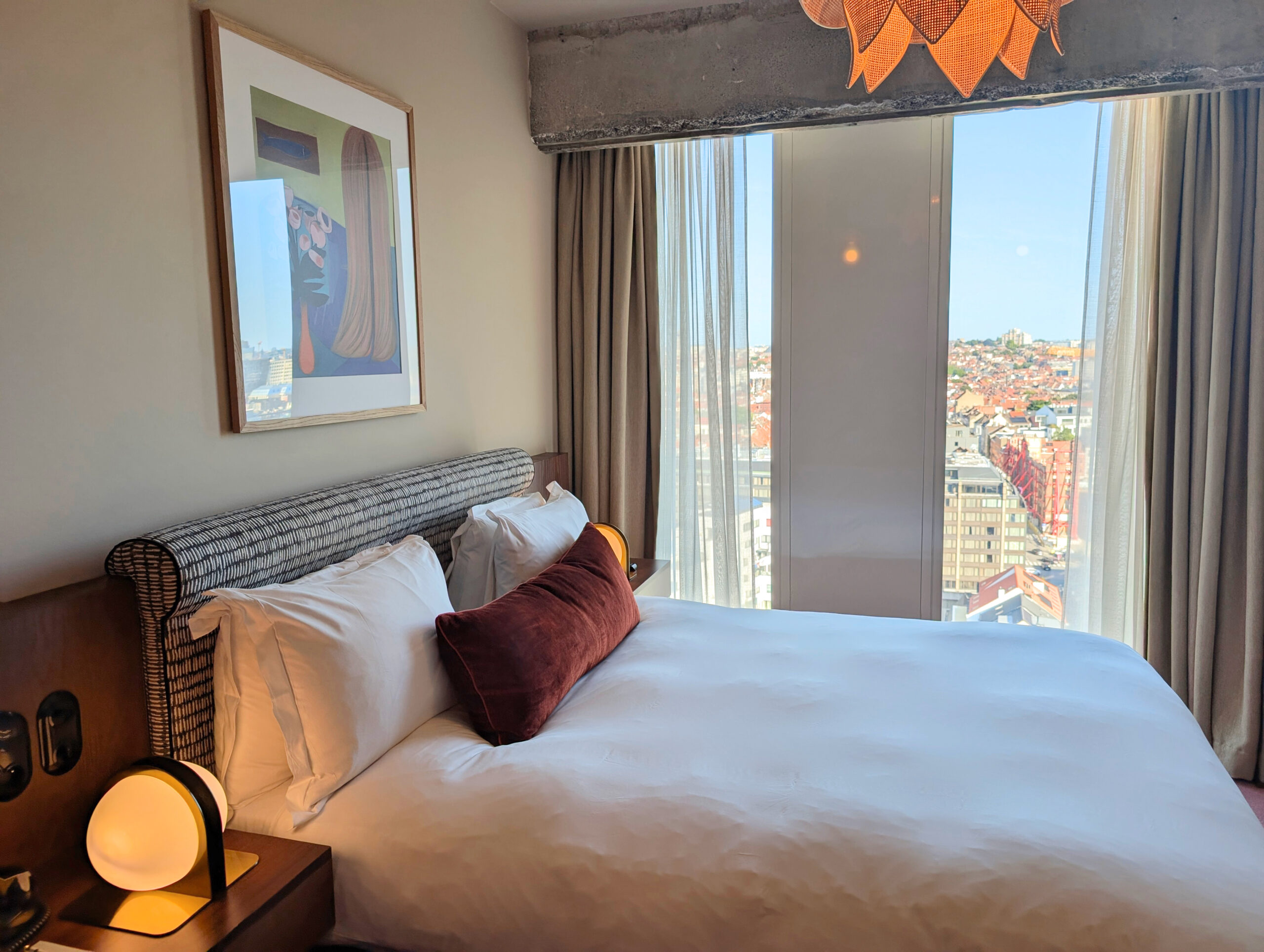 Il y a 192 chambres de 24m² à 32m² réparties en 3 catégories : Cosy, Roomy et Biggy. Toutes offrent une vue à couper le souffle sur Bruxelles. Le mobilier vintage est très réussi avec notamment les têtes de lit à rayures, tapis à motifs graphiques et lampes de chevet colorés.